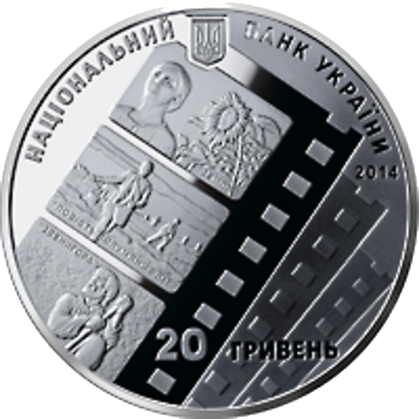 На аверсі монети розміщено: угорі малий Державний Герб України, напис півколом НАЦІОНАЛЬНИЙ БАНК УКРАЇНИ, під яким праворуч - рік карбування монети 2014; стилізовану композицію: на кіноплівці - кадри з фільмів `Земля`, `Повість полум`яних літ`, `Звенигора`; унизу номінал - 20 ГРИВЕНЬ.