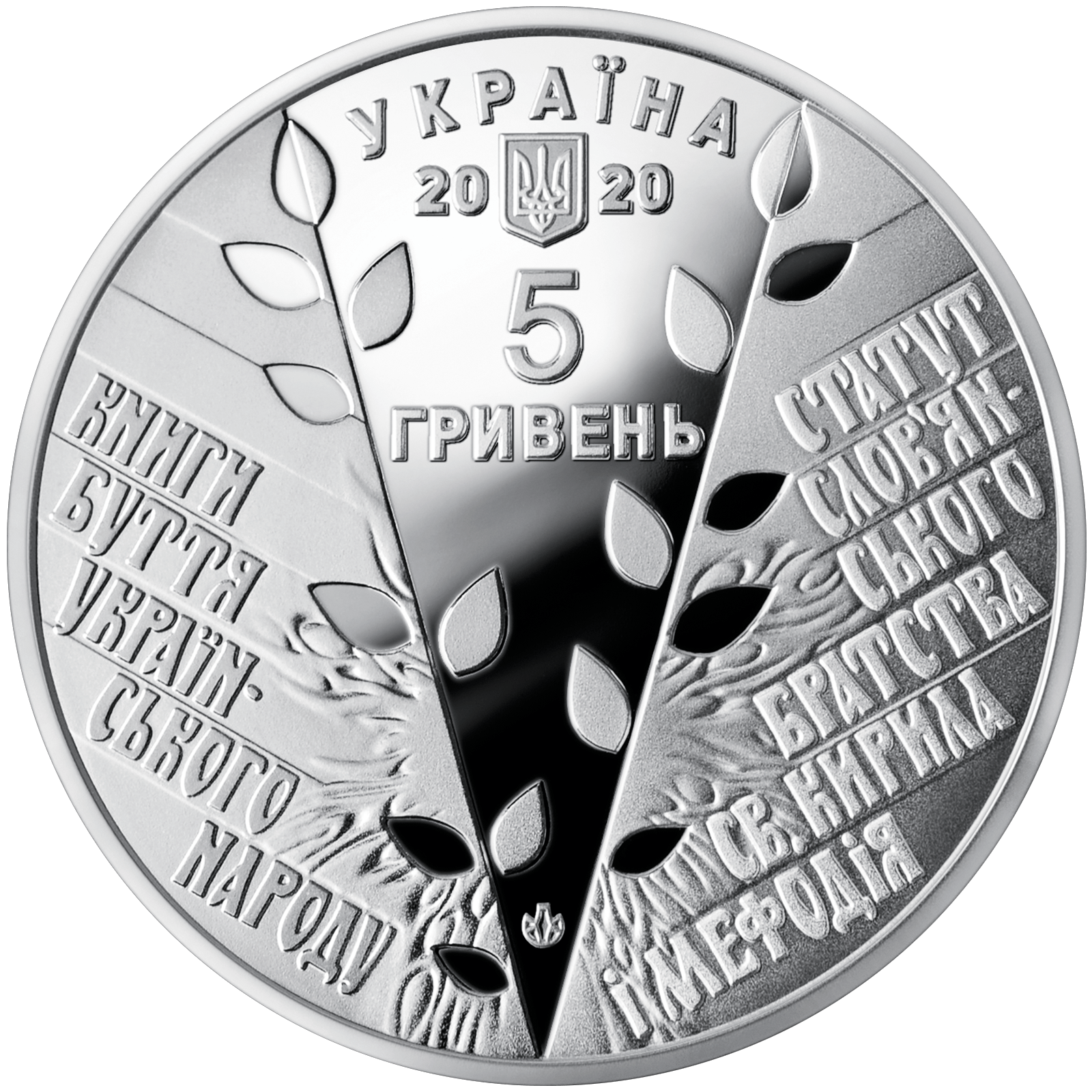 На аверсі монети розміщено: угорі на дзеркальному тлі – малий Державний Герб України, по обидва боки від якого – 2020, над гербом – напис УКРАЇНА; під гербом – номінал монети 5/ГРИВЕНЬ; по обидва боки від герба та написів – стилізовані пагони з листками; написи на матовому тлі: КNИГИ/ БУТТЯ/ УКРАЇN-/СЬКОГО/ NАРОДУ (ліворуч), СТАТУТ/ СЛОВ’ЯN-/СЬКОГО/БРАТСТВА/СВ. КИРИЛА/ І МЕФОДІЯ (праворуч); логотип Банкнотно-монетного двору Національного банку України (унизу).