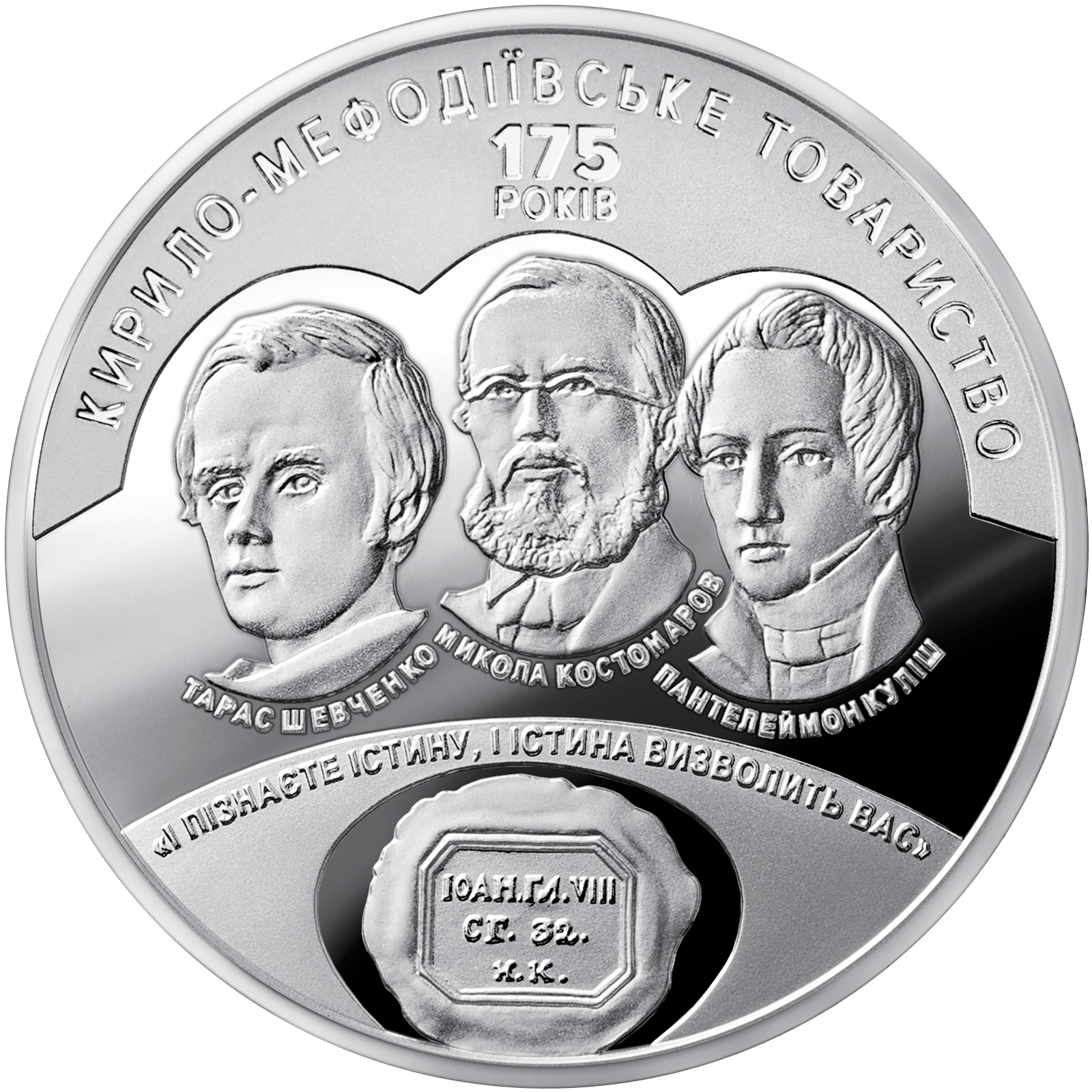 На реверсі монети на дзеркальному тлі зображено портрети членів товариства: Т. Шевченка (ліворуч), М. Костомарова (по центру), П. Куліша (праворуч), унизу – відбиток сургучевої печатки; написи: КИРИЛО-МЕФОДІЇВСЬКЕ ТОВАРИСТВО (угорі півколом), 175/РОКІВ (над портретами), ТАРАС ШЕВЧЕНКО (під портретом Т. Шевченка), МИКОЛА КОСТОМАРОВ (під портретом М. Костомарова), ПАНТЕЛЕЙМОН КУЛІШ (під портретом П. Куліша), «І ПІЗНАЄТЕ ІСТИНУ, І ІСТИНА ВИЗВОЛИТЬ ВАС» (півколом над відбитком печатки).