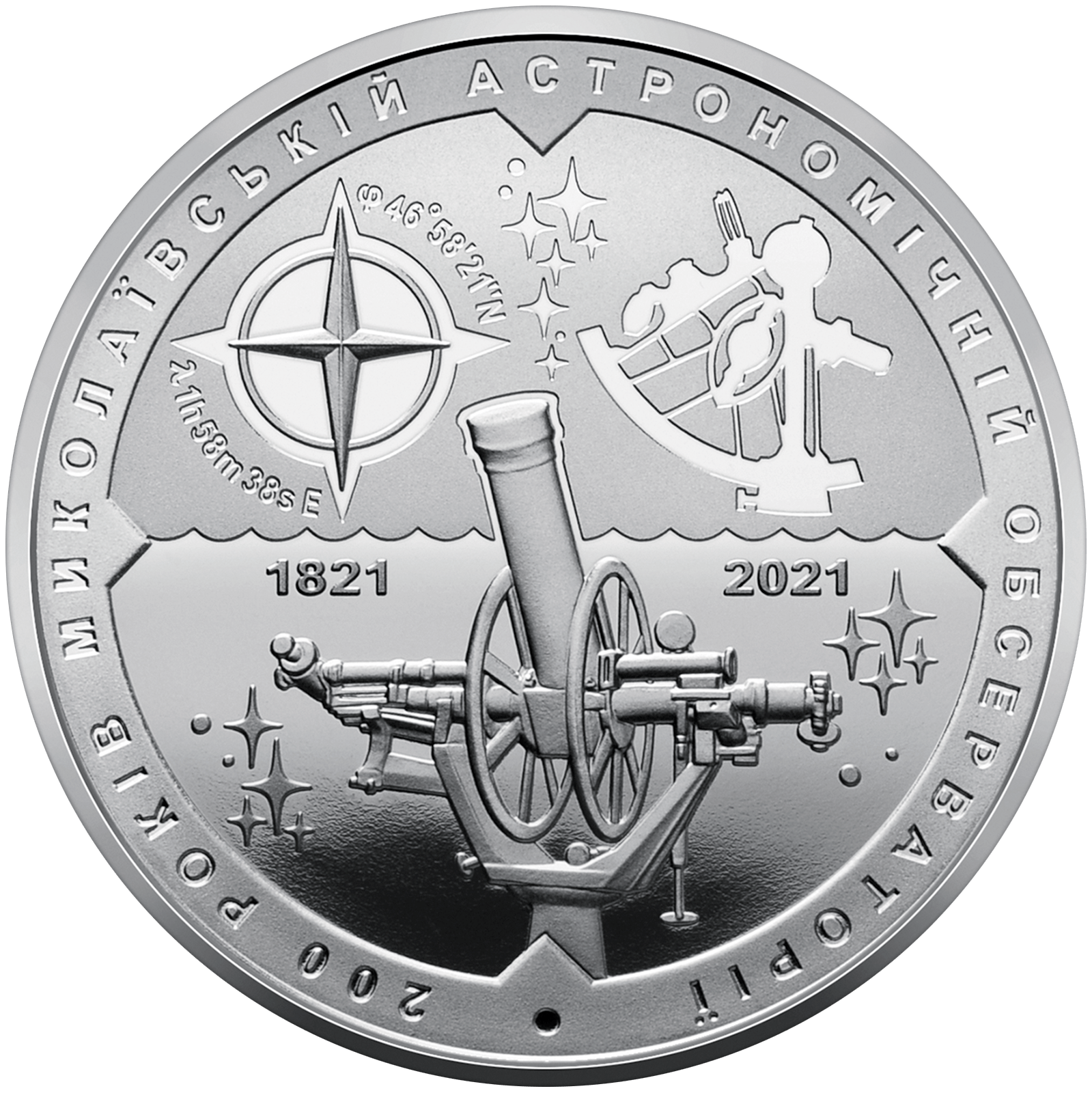 На реверсі монети розміщено астрономічні інструменти: на дзеркальному тлі – меридіанне коло, по обидва боки від якого написи: 1821 (ліворуч), 2021 (праворуч); над ним на матовому тлі: зображення символічного центру Миколаївської астрономічної обсерваторії з її координатами, визначеними першим директором обсерваторії Карлом фон Кнорре (ліворуч) та силует оптичного приладу – секстанта (праворуч); написи: 200 РОКІВ МИКОЛАЇВСЬКІЙ АСТРОНОМІЧНІЙ ОБСЕРВАТОРІЇ (по колу).