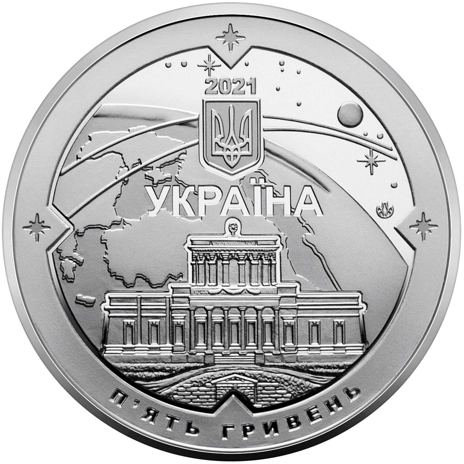 На аверсі монети на тлі стилізовано зображеного фрагмента земної кулі розміщено: малий Державний Герб України (угорі), написи: 2021 (над гербом), УКРАЇНА (під гербом); у центрі – історична будівля Миколаївської астрономічної обсерваторії, яка має особливу конструкцію, оригінальну круглу залу, кладку тощо; номінал – П’ЯТЬ ГРИВЕНЬ (унизу півколом); логотип Банкнотно-монетного двору Національного банку України (праворуч).