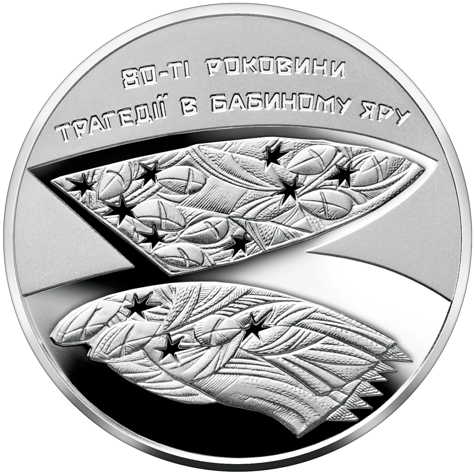 На реверсі монети зображено художньо-образну композицію, що відображає трагедію Бабиного Яру, – антропоморфні фігури, що нібито лежать під землею та уособлюють розстріляні сім’ї. Угорі розміщено напис: 80-ТІ РОКОВИНИ/ТРАГЕДІЇ В БАБИНОМУ ЯРУ.