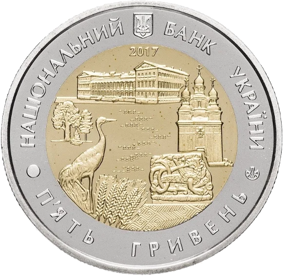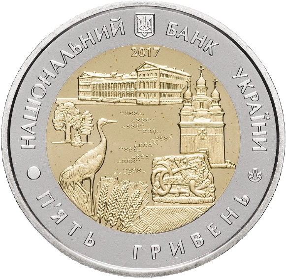На аверсі монети розміщено: угорі малий Державний Герб України, по колу написи: НАЦІОНАЛЬНИЙ БАНК УКРАЇНИ (угорі), під яким рік карбування монети - 2017, П`ЯТЬ ГРИВЕНЬ (унизу), праворуч - логотип Банкнотно-монетного двору Національного банку України; у центрі - стилізовану композицію, що символізує область: будівля Ніжинського державного університету імені Миколи Гоголя (угорі), праворуч - дерев`яна Георгіївська церква (м. Седнів), під якою шиферна плита з рельєфним орнаментом із Борисоглібського собору, унизу - меандровий орнамент (Мізинська стоянка), колосся, журавель, дерева та у центрі - стилізоване зображення Десни.