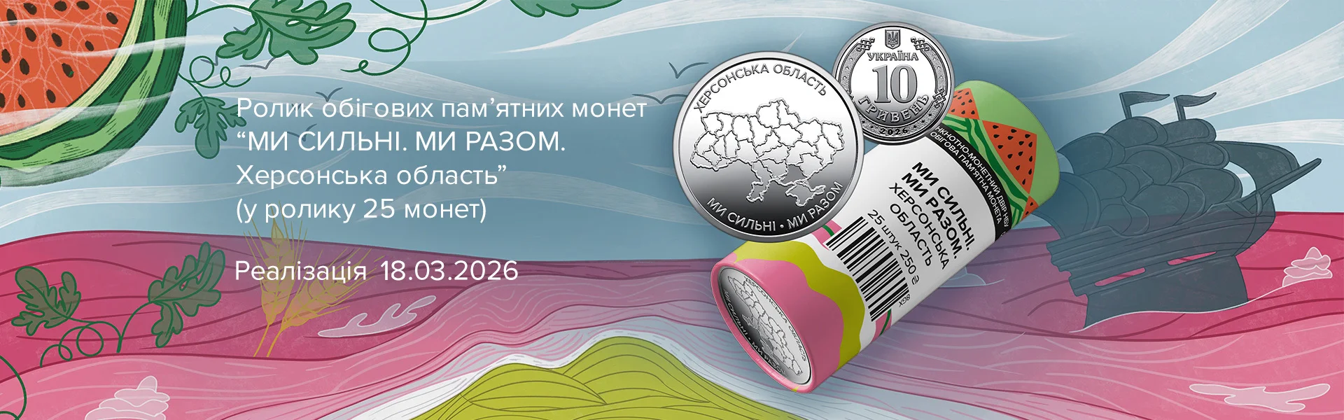 Ролик обігових пам`ятних монет "Ми сильні. Ми разом. Херсонська область" Ролик обігових пам’ятних монет присвячено невід’ємній частині України, визначеній Конституцією України, – Херсонській області. Її територіальна... 24 Лютого 2026