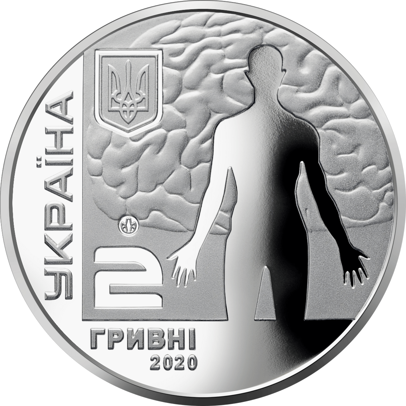 На аверсі монети розміщено: угорі ліворуч на рельєфному тлі – малий Державний Герб України, праворуч на тлі стилізованого рельєфного зображення мозку – дзеркальний абрис людини; унизу написи: 2/ ГРИВНІ/2020; ліворуч на дзеркальному тлі вертикальний напис – УКРАЇНА; логотип Банкнотно-монетного двору Національного банку України (над номіналом).