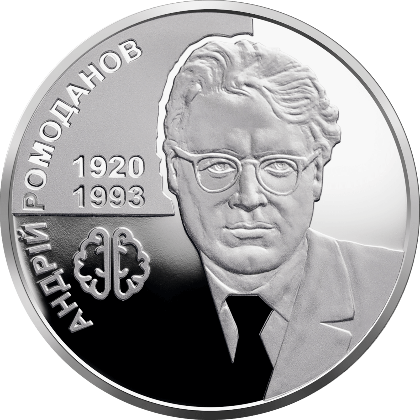 На реверсі монети праворуч зображено портрет Андрія Ромоданова, ліворуч від нього написи: 1920/1993 (роки життя); АНДРІЙ РОМОДАНОВ (півколом) та графічне зображення головного мозку людини (на дзеркальному тлі).