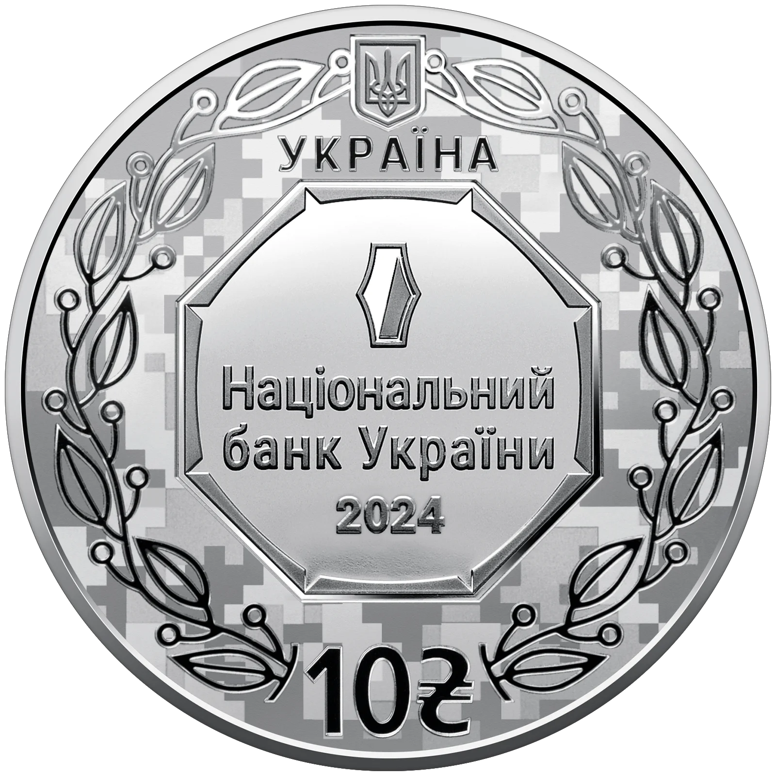 На аверсі монети розміщено: угорі малий Державний Герб України, під яким напис – УКРАЇНА; по колу на тлі патерну з ММ-14 (“Малюнка маскувального зразка 2014 року”, відомого також під неофіційними назвами “Піксель” та “Український піксель”) зображено стилізований лавровий вінок, що символізує славу та перемогу; унизу номінал 10 та графічний символ гривні. У центрі у восьмикутному картуші на дзеркальному тлі зображено логотип, під яким написи: НАЦІОНАЛЬНИЙ / БАНК УКРАЇНИ / 2024.