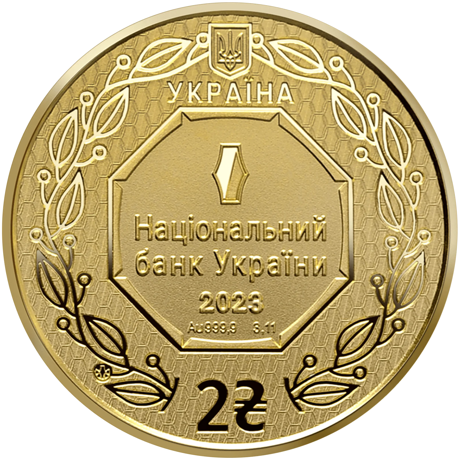 На аверсі монети розміщено: угорі малий Державний Герб України, під яким напис – УКРАЇНА, по колу на тлі патерну зі стилізованих давньоруських київських гривен – вагової, лічильної та монетної одиниці зображено стилізований лавровий вінок, унизу номінал – 2; у центрі у восьмикутному картуші на дзеркальному тлі зображено логотип, під яким написи: НАЦІОНАЛЬНИЙ/БАНК УКРАЇНИ/ 2020 (рік карбування) / Au 999,9 3,11 (позначення металу, його проби і маси в чистоті). Унизу ліворуч розміщено логотип Банкнотно-монетного двору Національного банку України.