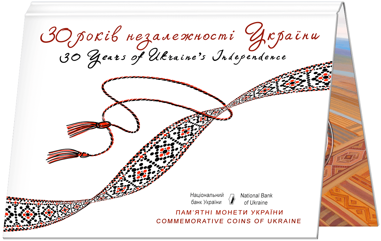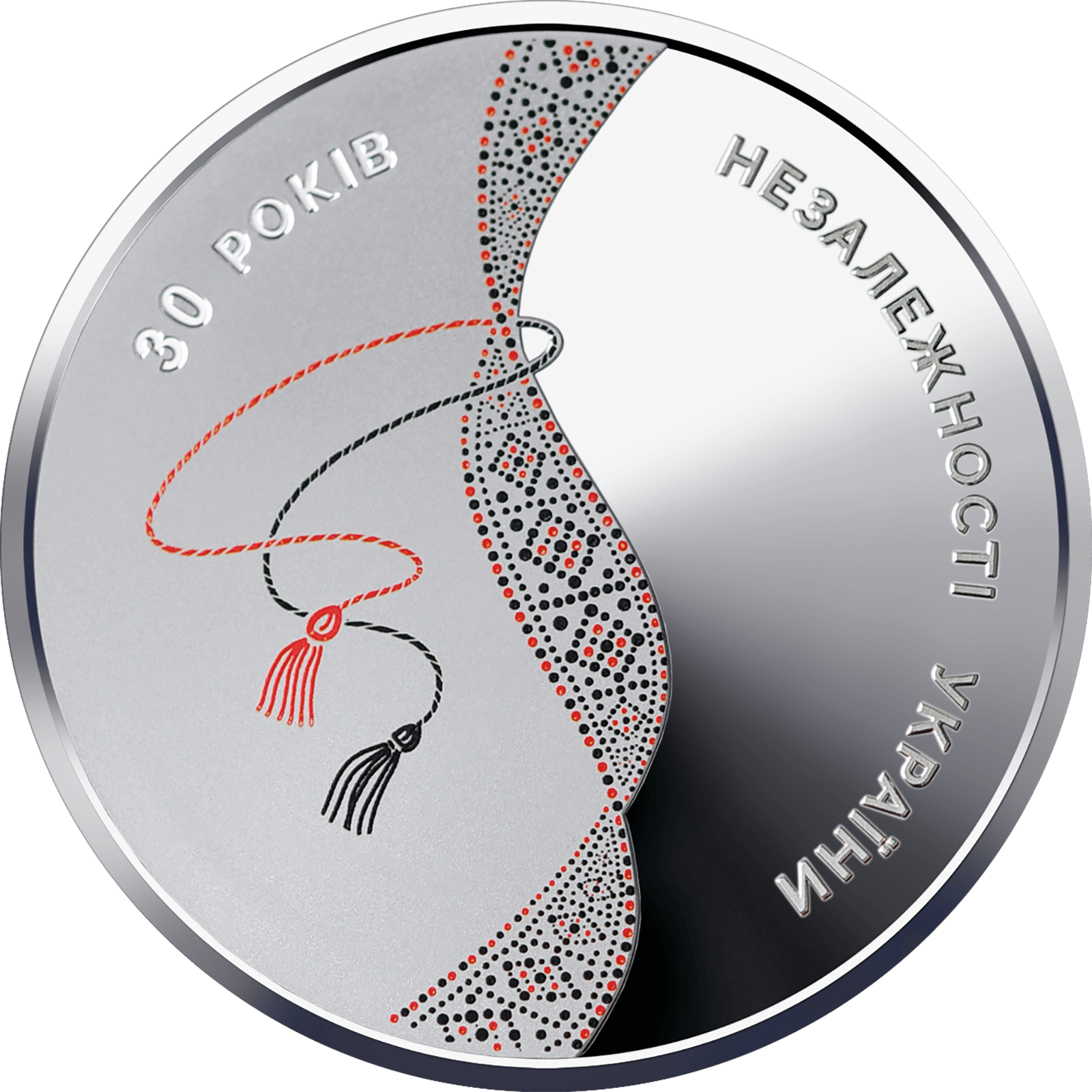 На реверсі монети зображено кольорову вишивану стрічку (використано тамподрук), що символізує код нації і нагадує ДНК, яка є матеріальним носієм генетичної інформації, тобто забезпечує збереження, передавання і відтворення інформації, та півколом розміщено написи: 30 РОКІВ (угорі ліворуч на матовому тлі) НЕЗАЛЕЖНОСТІ УКРАЇНИ (праворуч на дзеркальному тлі).