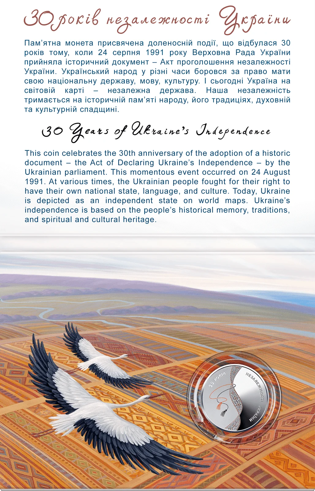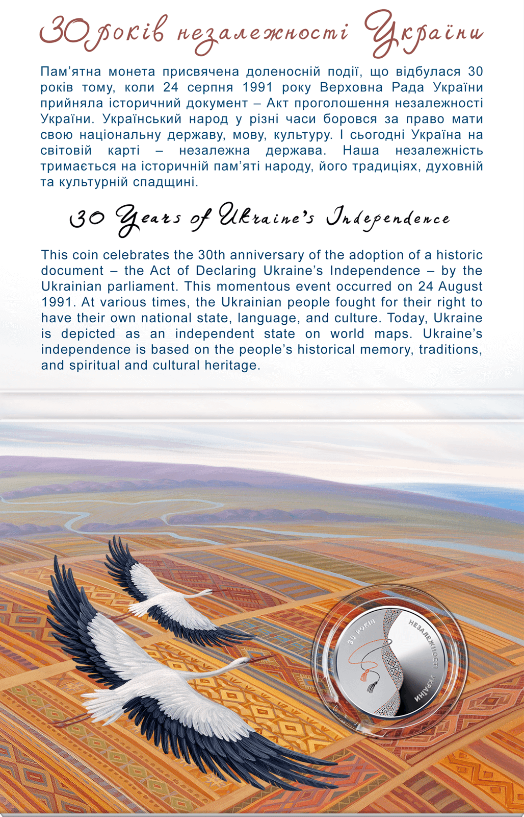 Присвячена доленосній події, що відбулася 30 років тому, коли 24 серпня 1991 року Верховна Рада України прийняла історичний документ – Акт проголошення незалежності України. Український народ у різні часи боровся за право мати свою національну державу, мову, культуру. І сьогодні Україна на світовій карті – незалежна держава. Витоки нашої незалежності – в історичній пам’яті народу, його традиціях, духовній та культурній спадщині.