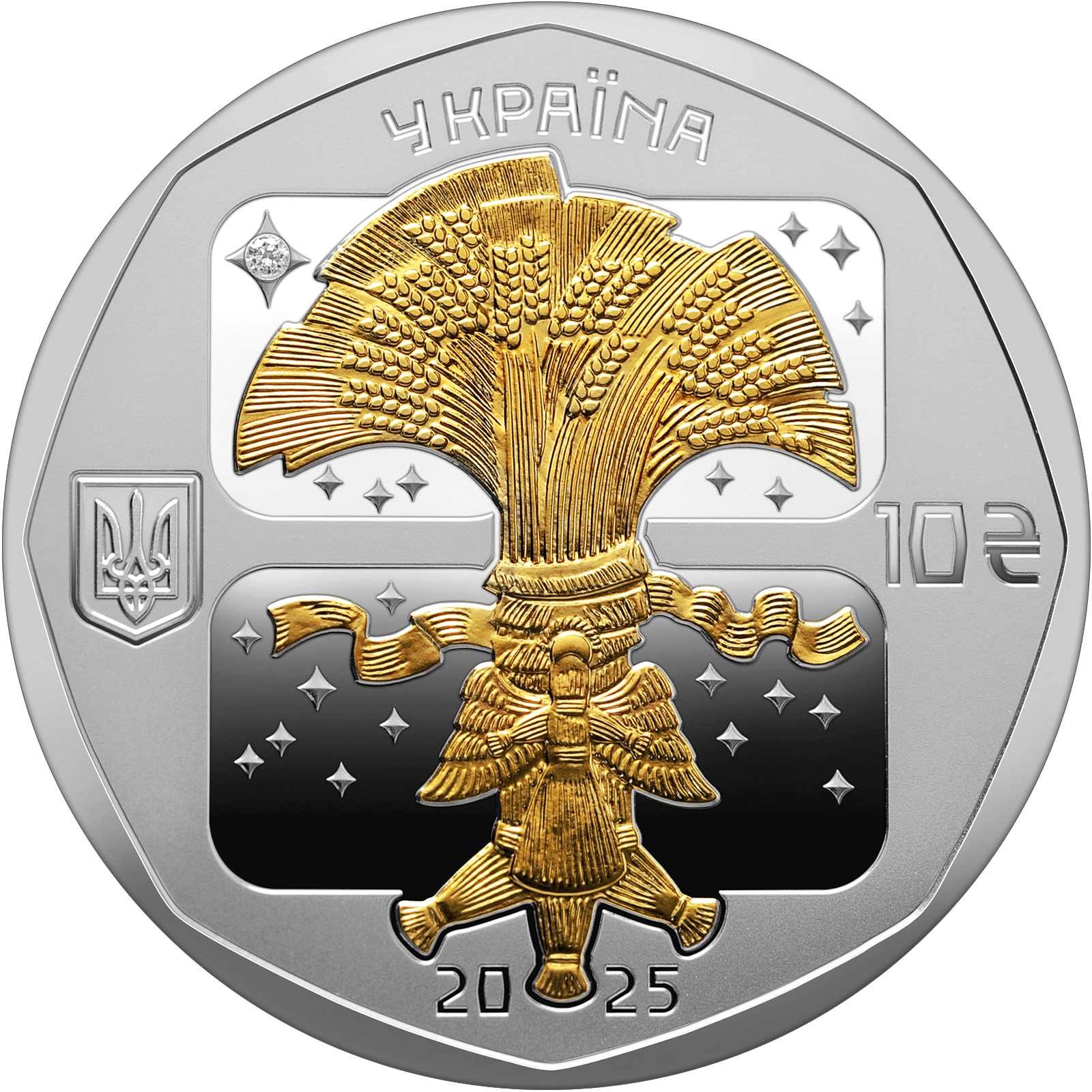 На аверсі монети в центрі композиції розміщено стилізоване зображення солом’яного дідуха – традиційного атрибута українського Різдва (елемент оздоблення – локальна позолота). Основу дідуха прикрашає солом’яний янгол, що символізує захист і благу вість. Тло композиції розділене на дві площини, що нагадують вікно, осяяне світлом зірок у Святвечір. У центрі однієї із зірок (ліворуч) сяє діамант, що символізує Віфлеємську зорю. Угорі розміщено напис УКРАЇНА; унизу – рік карбування 2025; ліворуч – малий Державний Герб України; праворуч – номінал 10 та графічний знак гривні.