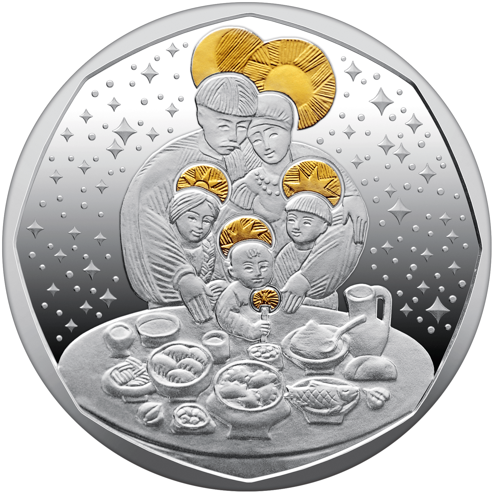На реверсі монети зображена сповнена тепла і затишку традиційна передріздвяна трапеза української сім’ї, де образи батька, матері та дітей візуально ототожнюються з небесними світилами (елемент оздоблення – локальна позолота): німби навколо їхніх голів символізують Сонце (дружина), Місяць (чоловік) та зірки (їхні діти). Перед родиною – стіл із дванадцятьма стравами: кутею, варениками, пампухами, рибою та іншими традиційними частуваннями, а також головками часнику – оберегом від нечистої сили.