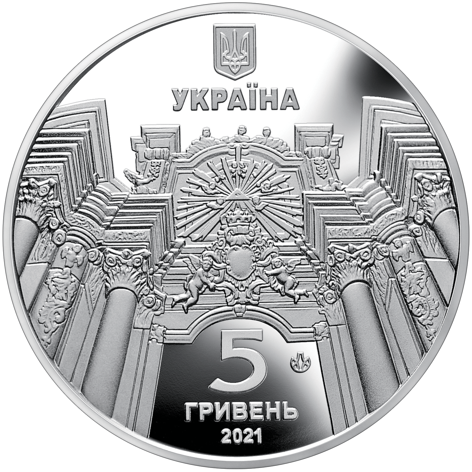 На аверсі монети розміщено: малий Державний Герб України, під яким напис УКРАЇНА; фрагмент інтер’єру центрального нефу, унизу на дзеркальному тлі номінал монети і рік карбування – 5/ГРИВЕНЬ/2021; логотип Банкнотно-монетного двору Національного банку України (унизу праворуч).