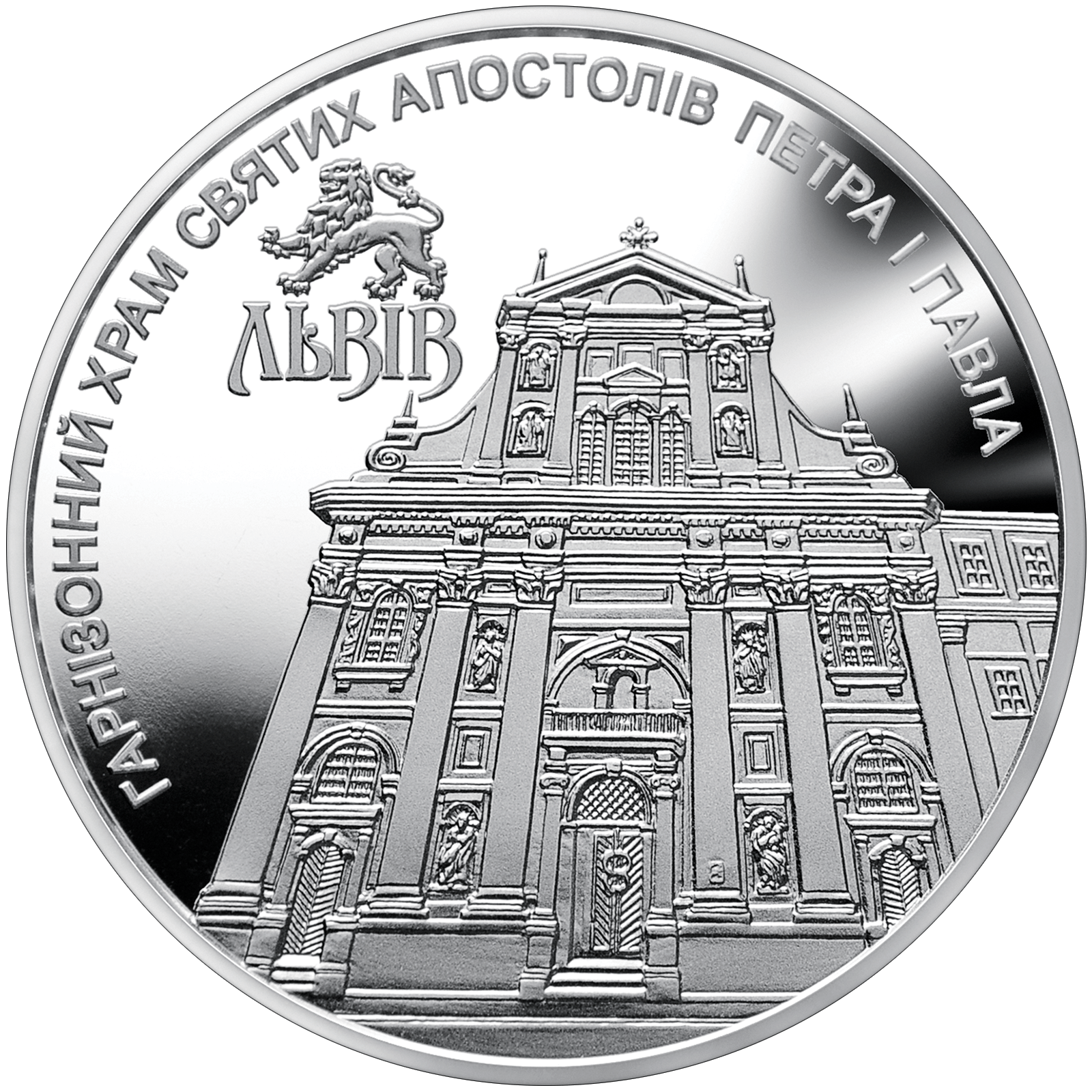 На реверсі монети зображено фасад будівлі храму, угорі ліворуч від якого – лев та напис ЛЬВІВ (під левом); написи: ГАРНІЗОННИЙ ХРАМ СВЯТИХ АПОСТОЛІВ ПЕТРА І ПАВЛА (півколом ліворуч).