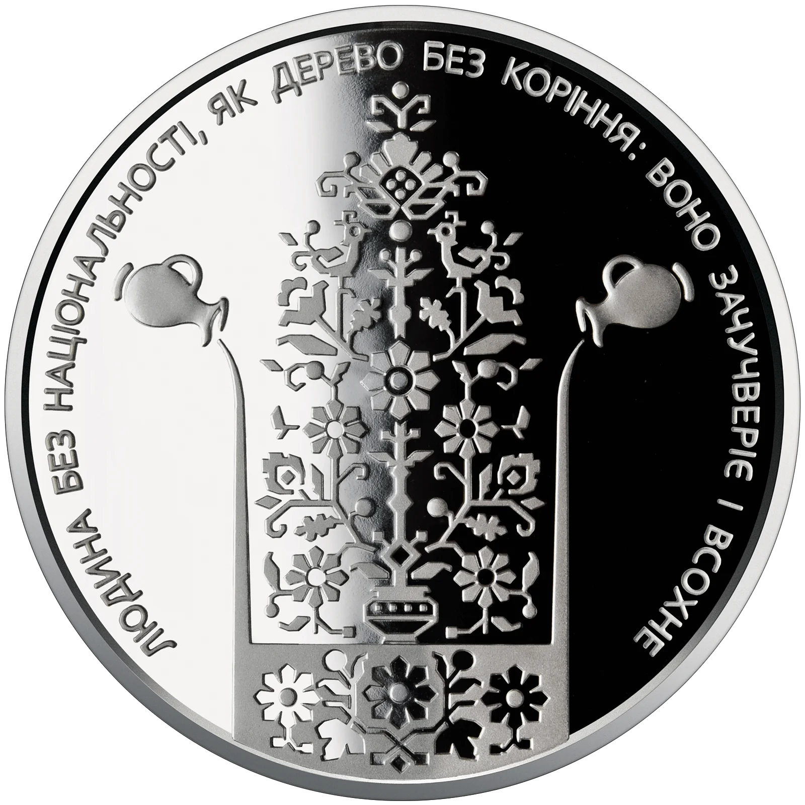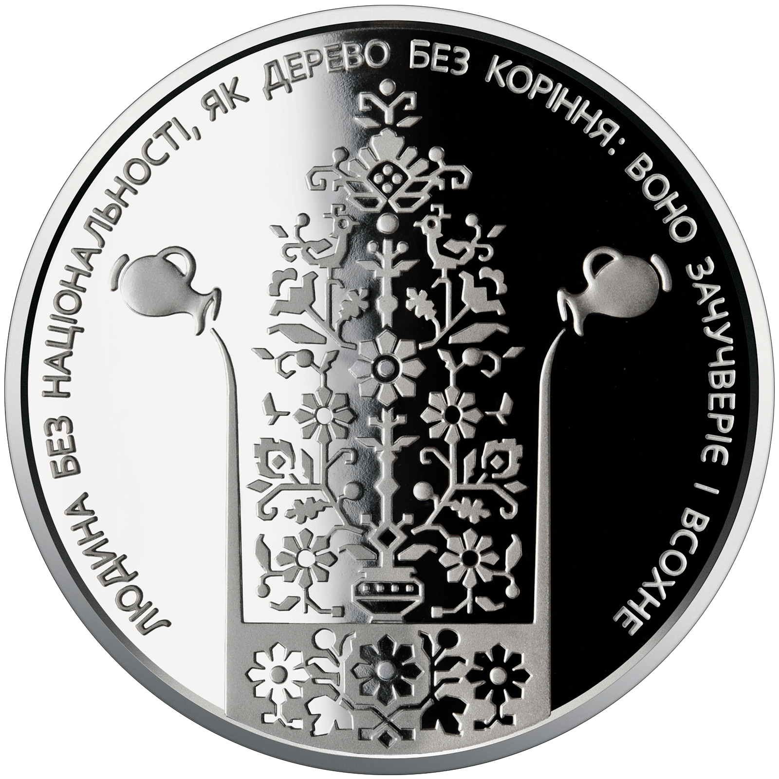 На реверсі монети на дзеркальному тлі розміщено стилізовану композицію: дерево життя, по обидва боки від якого глечики, з яких ллється вода, що підживлює дерево; по колу - вислів письменника: ЛЮДИНА БЕЗ НАЦІОНАЛЬНОСТІ, ЯК ДЕРЕВО БЕЗ КОРІННЯ: ВОНО ЗАЧУЧВЕРІЄ І ВСОХНЕ.