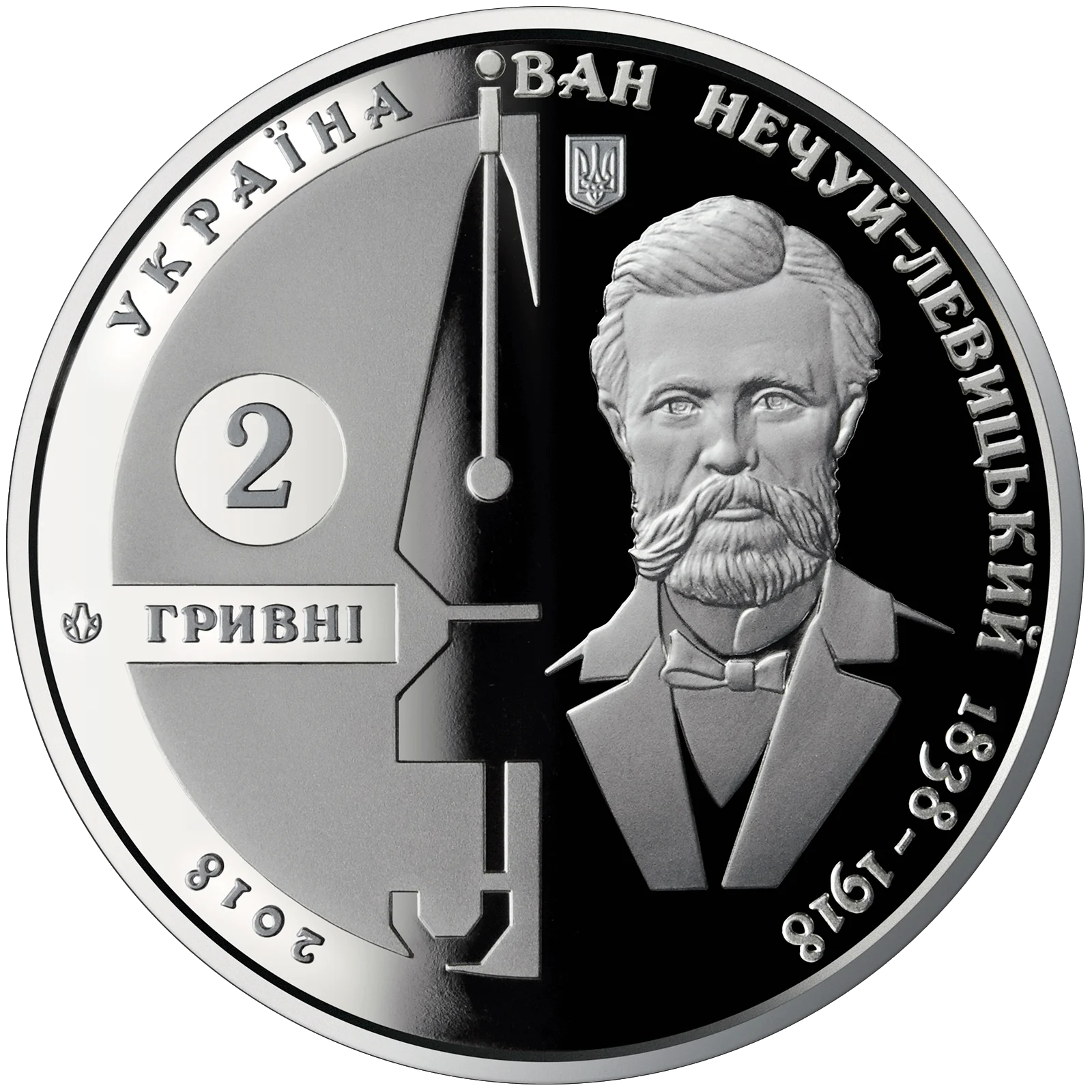 На аверсі монети розміщено: угорі - малий Державний Герб України; праворуч на дзеркальному тлі - портрет І. Нечуя-Левицького, поруч з яким - стилізована парасоля (його незмінний атрибут), що нагадує письменницьке перо, ліворуч: номінал монети 2/ГРИВНІ, логотип Банкнотно-монетного двору Національного банку України; написи по колу: УКРАЇНА (угорі ліворуч), праворуч - ІВАН НЕЧУЙ-ЛЕВИЦЬКИЙ 1838 - 1918; унизу ліворуч - рік карбування монети 2018.