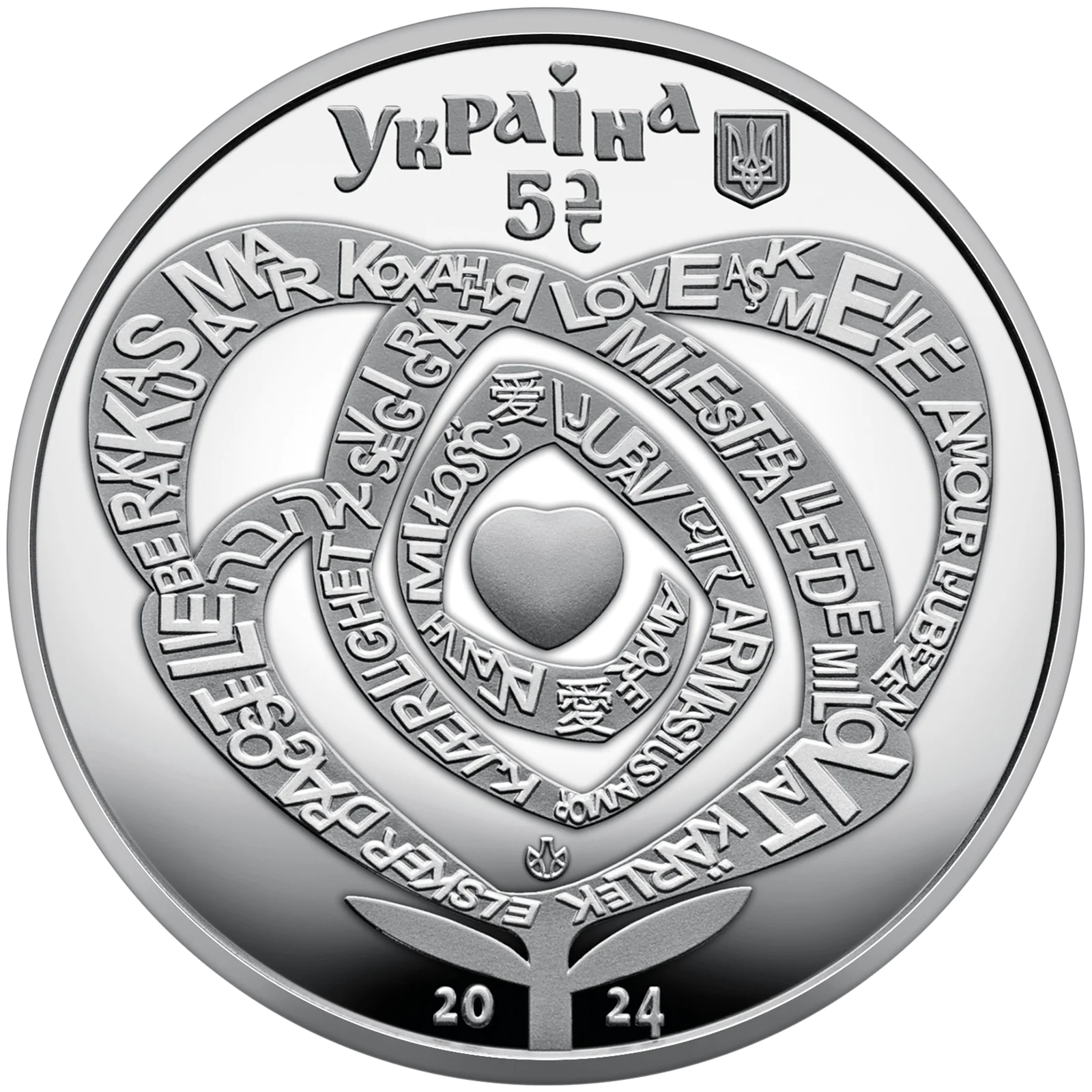 На аверсі монети на дзеркальному тлі розміщено: стилізовану у вигляді серця троянду, у графічне полотно якої вписано слово “кохання” найпоширенішими мовами світу, що підкреслює універсальність та безмежність цього почуття, яке не знає кордонів та мовних бар’єрів; малий Державний Герб України, напис УКРАЇНА (крапки над літерою “ї” зображено у формі серця), номінал 5 та графічний символ гривні (угорі над трояндою); логотип Банкнотно-монетного двору Національного банку України (над стеблом троянди), напис 20 / 24 (унизу).