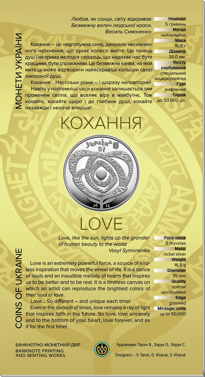Пам’ятна монета “Кохання”, присвячена таємничій симфонії емоцій, яка розквітає в серцях людей. Дивовижному почуттю, яке протягом століть надихало поетів, художників, музикантів та мрійників.