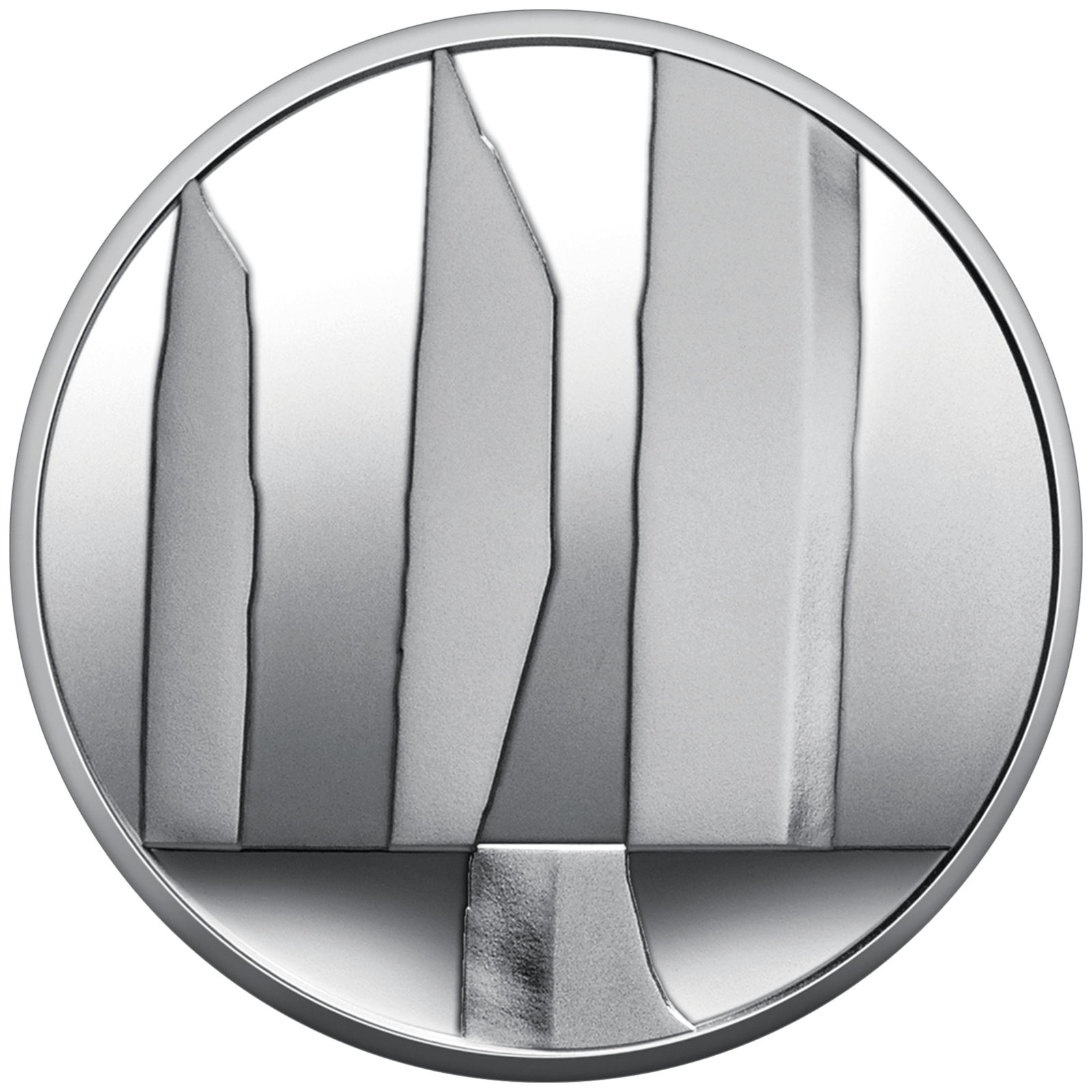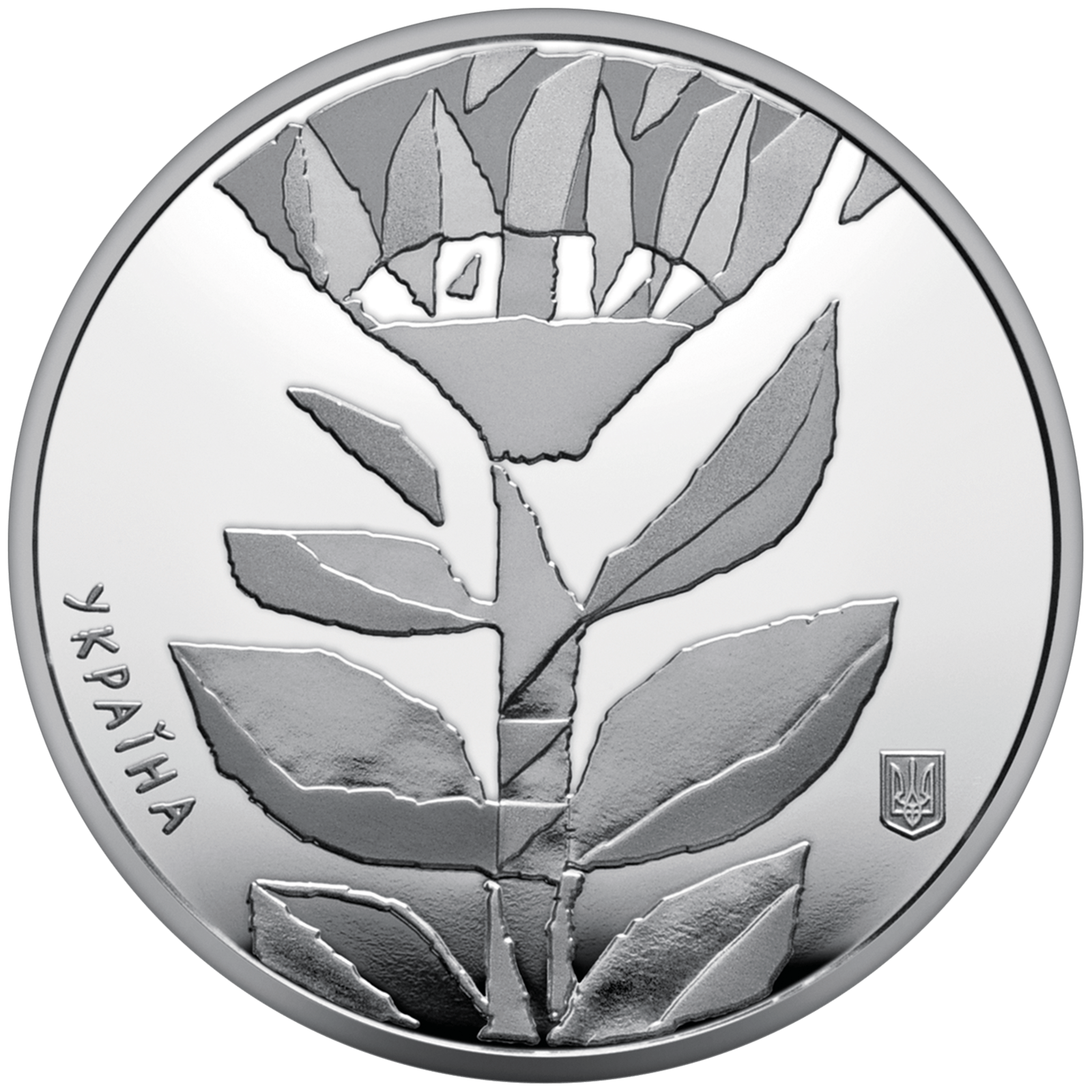 На реверсі монети, у вигляді непорушних та сяючих брил, розміщено стилізований тризуб, який під час обертання монети трансформується в літеру