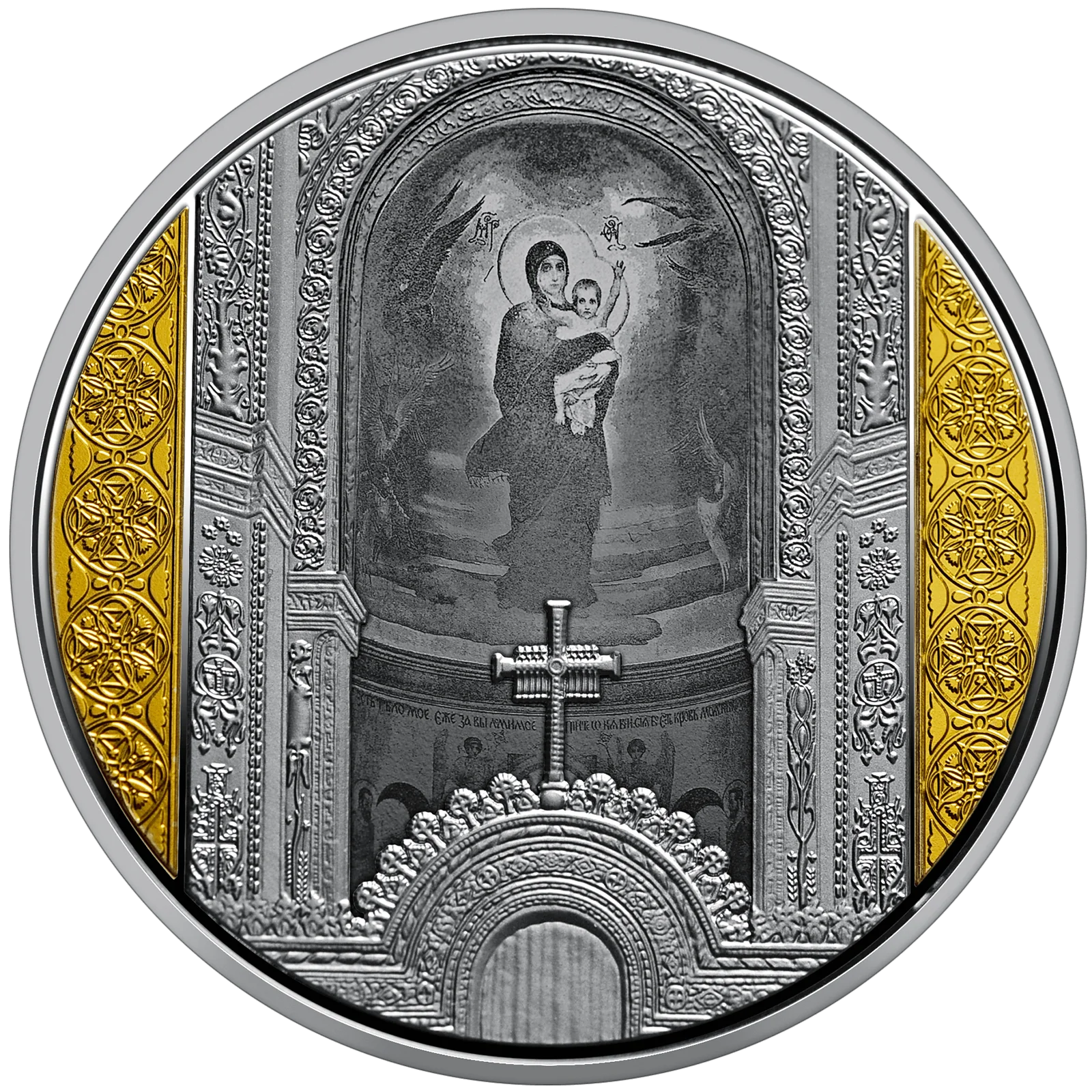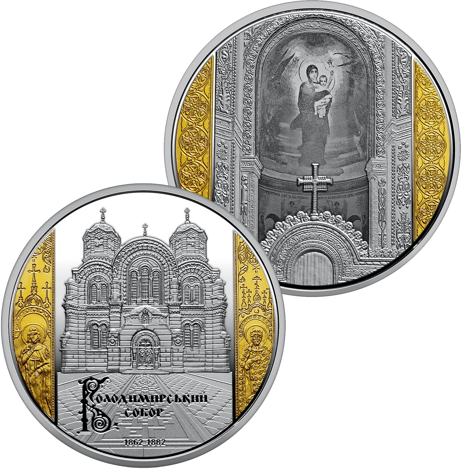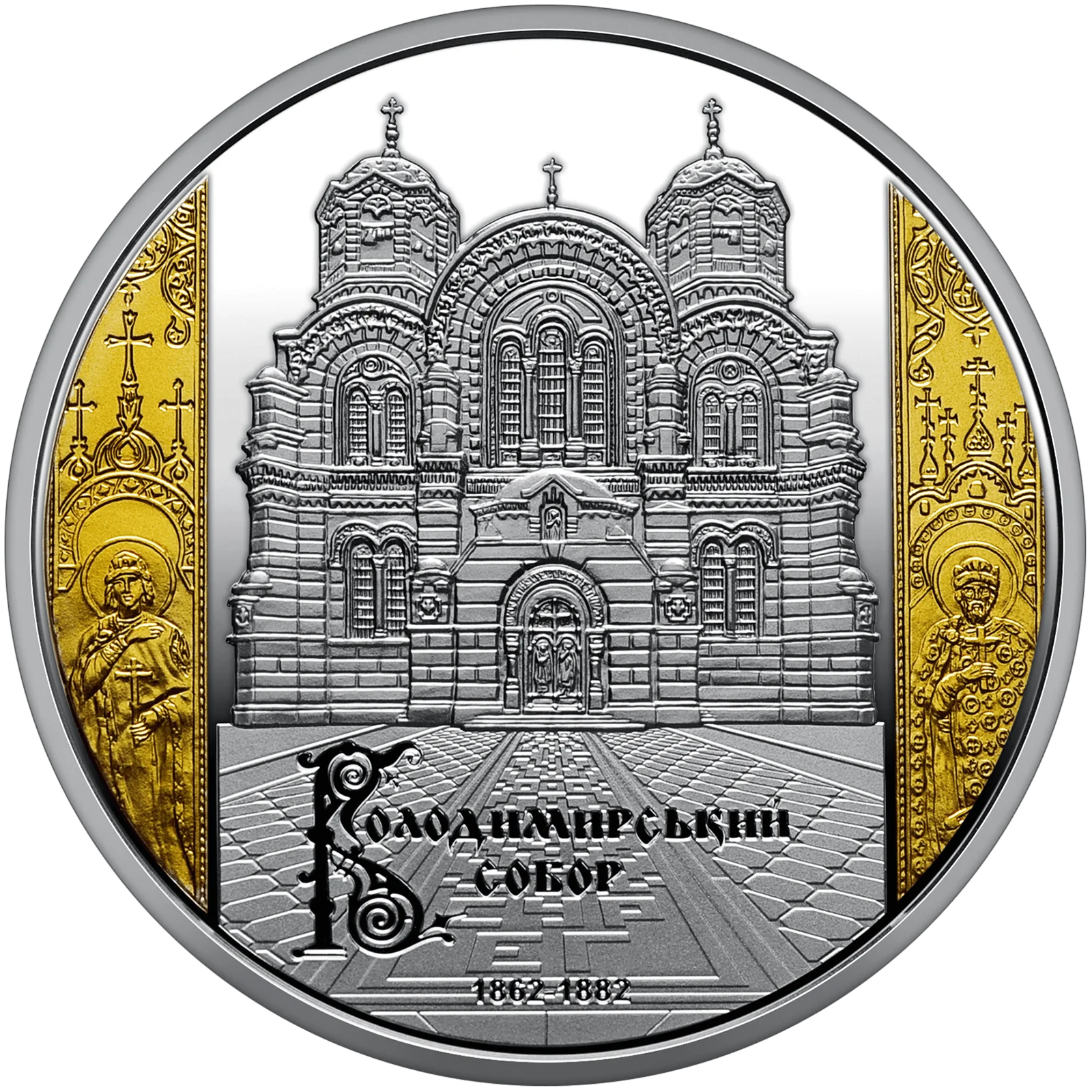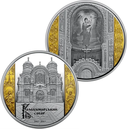 Набір із двох пам’ятних монет присвячений одній з архітектурних перлин Києва національного значення – Володимирському собору. Побудований у неовізантійському стилі, він привертає увагу як своєю історією, так і внутрішнім розписом – справжнім шедевром мистецтва. На спорудження собору, яке тривало 20 років – із 1862 до 1882 року – було зібрано значну кількість пожертв. Більше 10 років продовжувалися роботи над внутрішнім оздобленням храму, унікальні розписи є його основною цінністю, завдяки яким собор отримав статус пам’ятки культури. На стінах храму зображено не тільки образи святих, але й історичні сюжети: хрещення князя Володимира, хрещення киян, а також портрети історичних осіб.