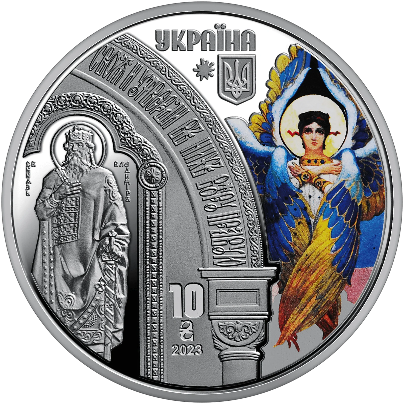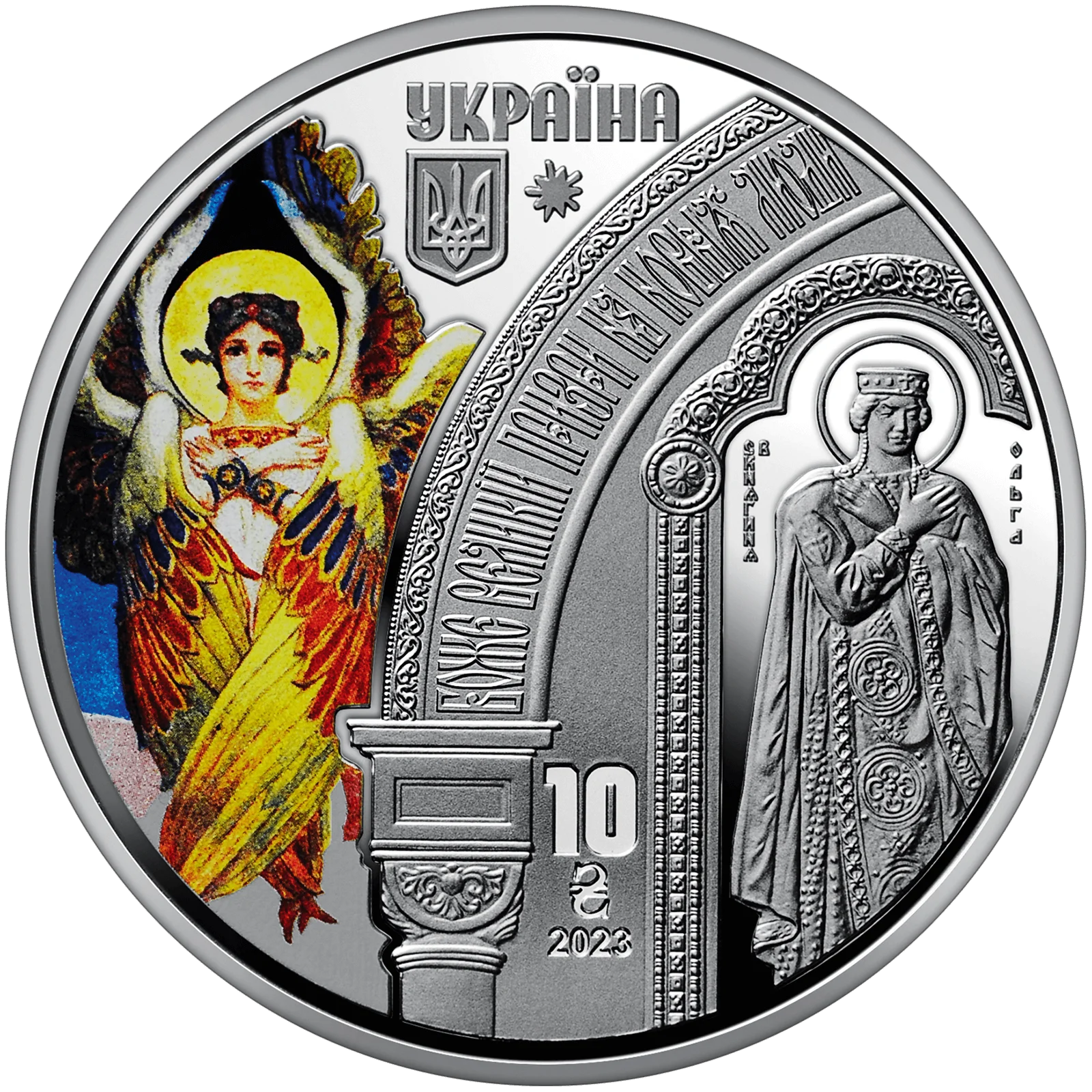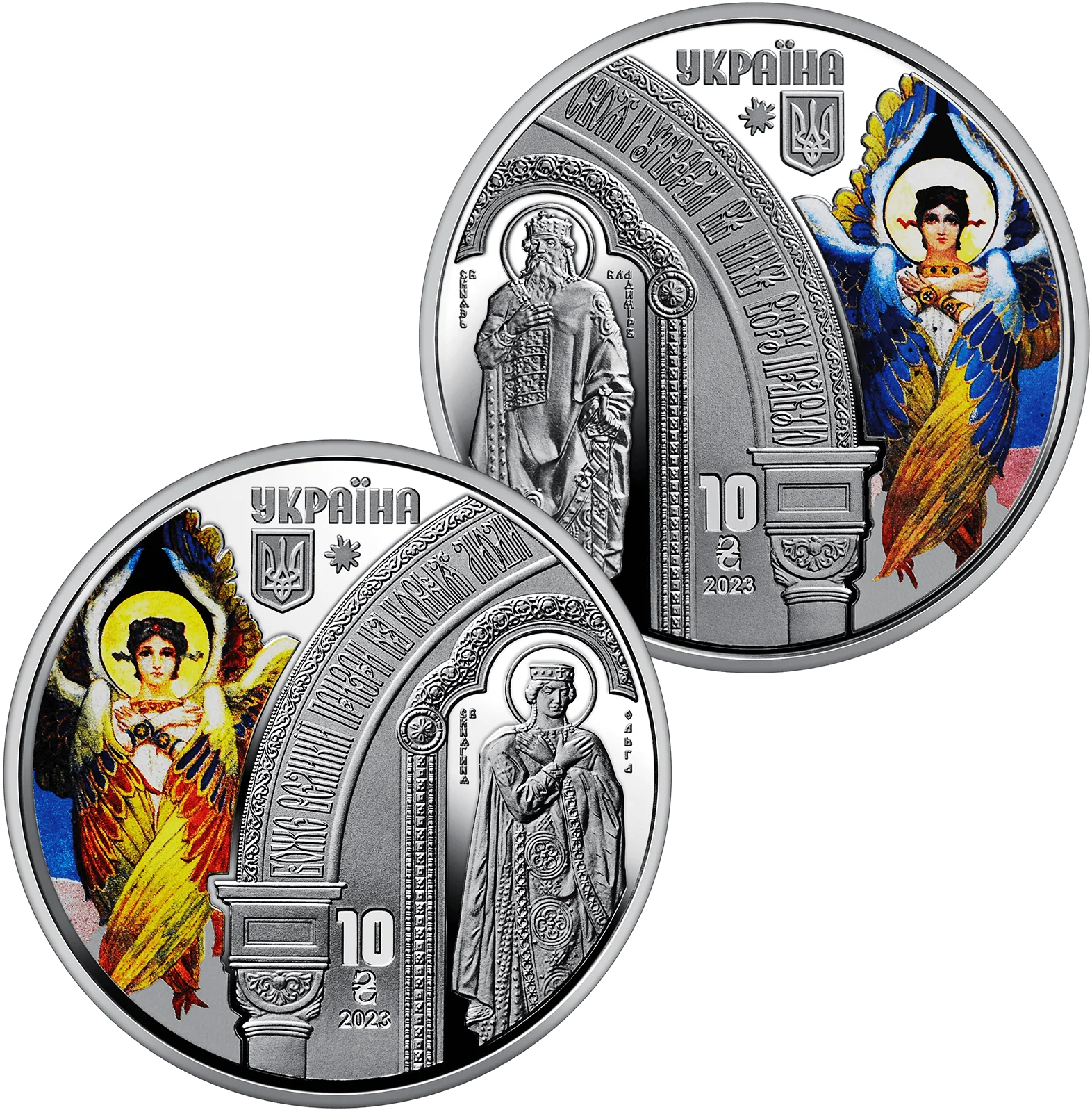 На аверсі монет із набору розміщено: угорі – напис УКРАЇНА, малий Державний Герб України; унизу – номінал монет 10 та графічний знак гривні, рік карбування 2023; у центрі розміщено фрагменти центральних воріт собору, на яких зображено княгиню Ольгу та князя Володимира, ліворуч і праворуч від них – серафими, чиї зображення розміщені на центральному куполі собору (використано тамподрук).