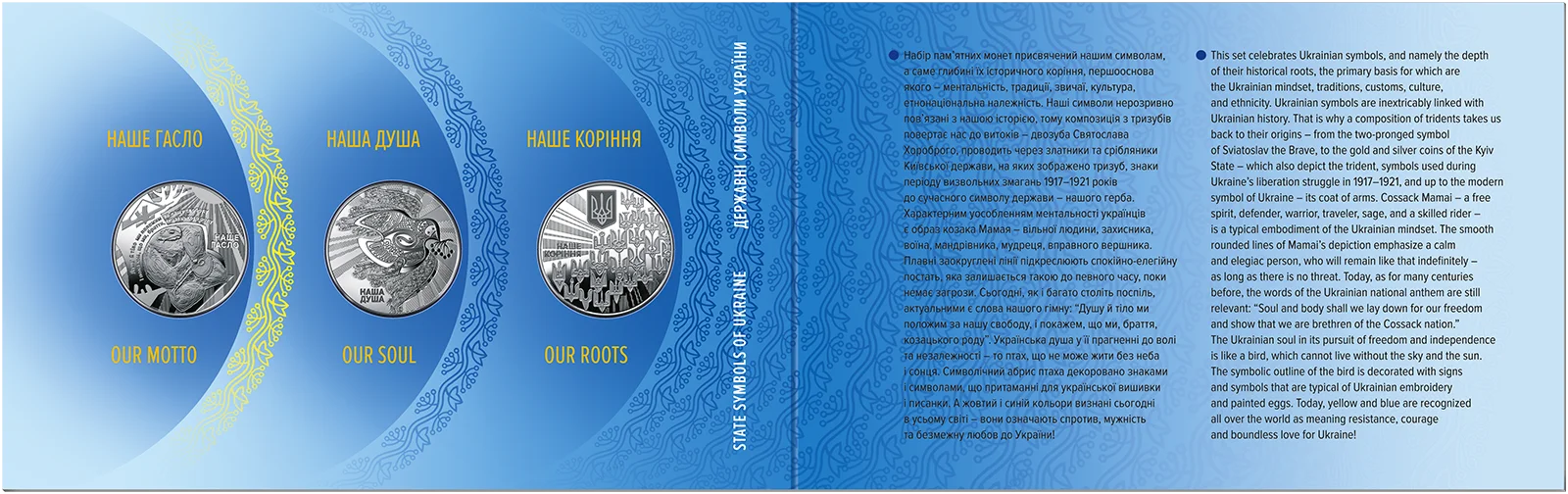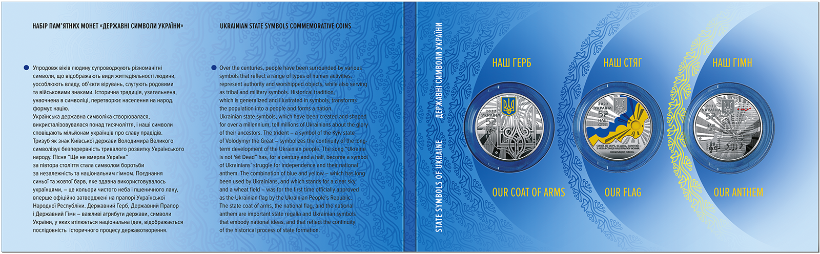 Набір із трьох пам`ятних монет `Державні символи України`присвячений головним атрибутам держави, символам України, в яких втілюється національна ідея, відображається державна історична тяглість. Наші символи сповіщають мільйонам українців про славу прадідів. Тризуб як знак Київської держави Володимира Великого символізує безперервність історичного розвитку Українського народу. Пісня “Ще не вмерла Україна” за півтора століття стала потужним символом боротьби за незалежність та національним гімном. Поєднання синьої та жовтої барв, яке здавна використовувалось українцями для власної ідентичності, – це кольори чистого неба і пшеничного лану, офіційно затверджені ще на прапорі Української Народної Республіки. До набору входять пам’ятні монети “Наш герб”, “Наш стяг”, “Наш гімн” .