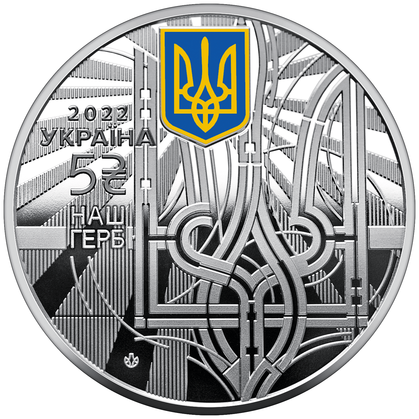 На аверсі монети “Наш герб” розміщено: угорі – малий Державний Герб України, золотий тризуб на синьому щиті (використано тамподрук); на тлі променів – стилізований Знак Княжої Держави Володимира Великого, зображення якого відтворює схему побудови тризуба; ліворуч написи: 2022/УКРАЇНА/5 і графічний символ гривні/НАШ/ГЕРБ; логотип Банкнотно-монетного двору Національного банку України (унизу).