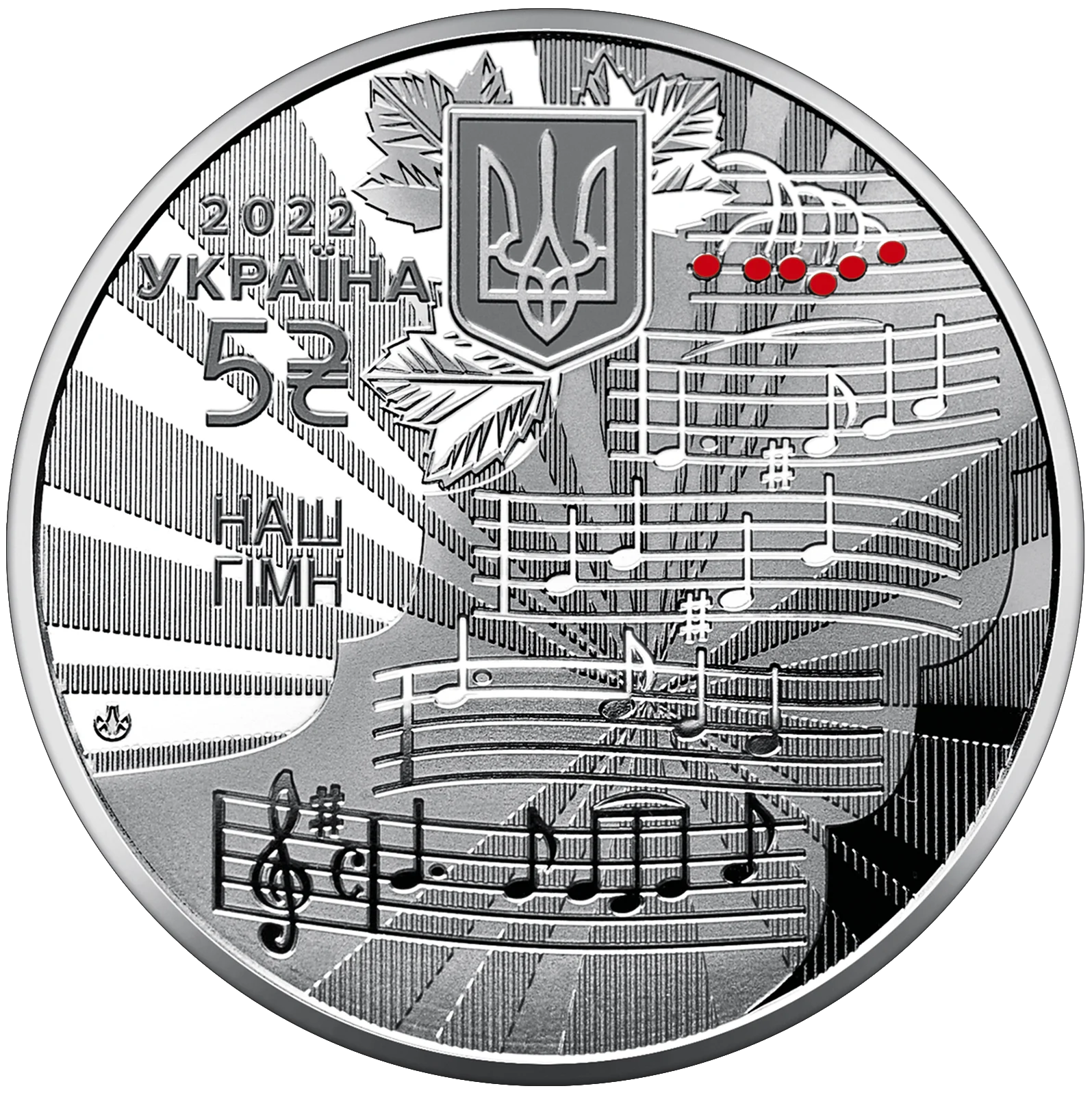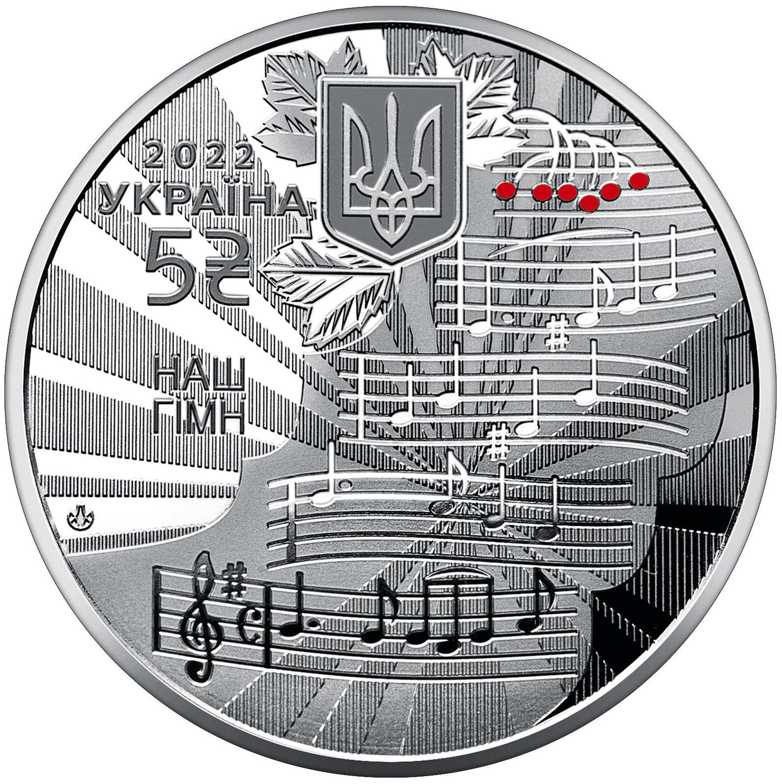 На аверсі монети “Наш гімн” розміщено: на тлі гілки калини з червоними ягідками (використано тамподрук) – малий Державний Герб України та нотні рядки на тлі променів; ліворуч написи: 2022/УКРАЇНА/5 і графічний символ гривні/НАШ/ГІМН та логотип Банкнотно-монетного двору Національного банку України.