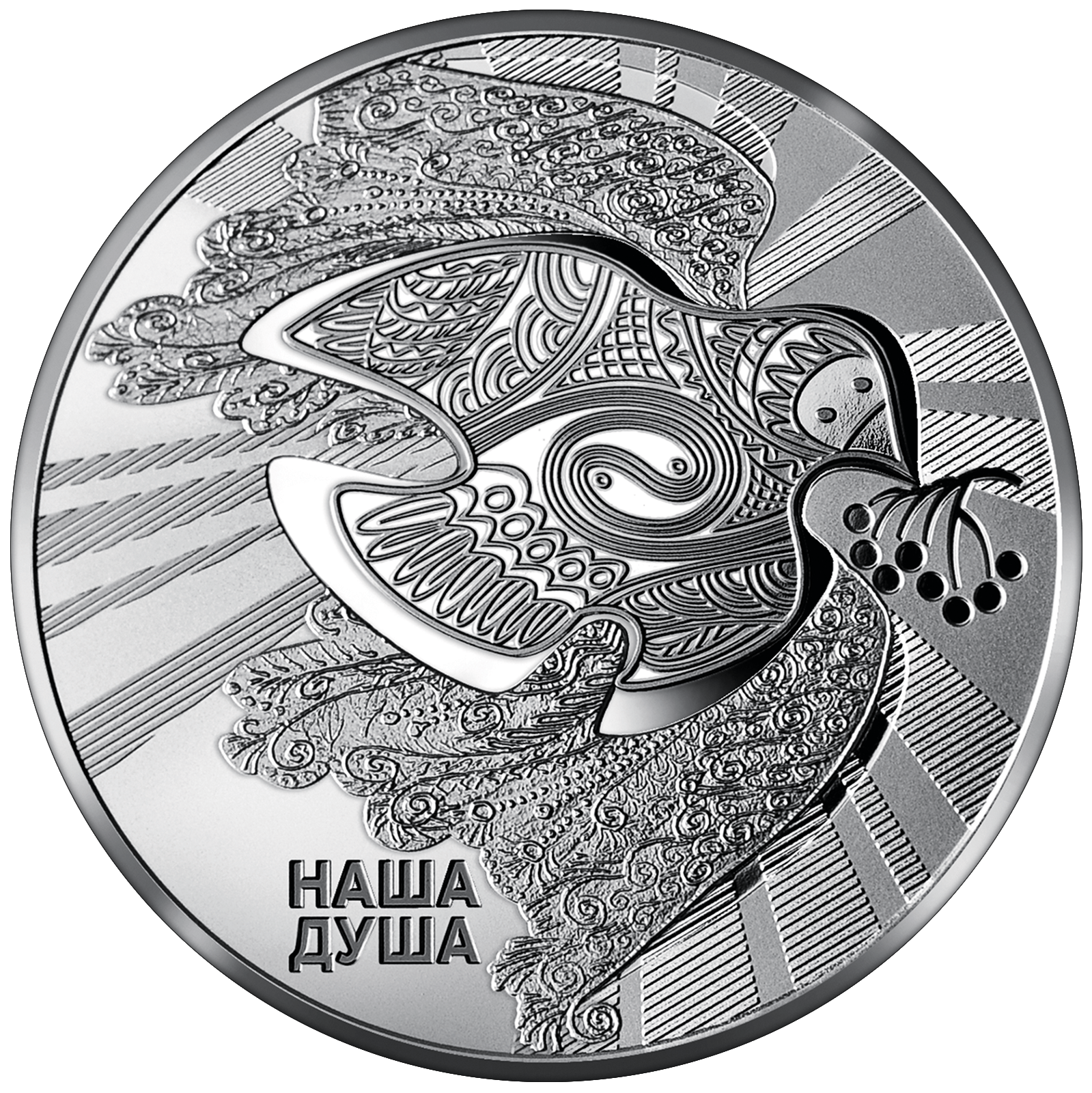На реверсі монети “Наш стяг” в обрамленні променів зображено оздобленого орнаментами стилізованого птаха, який тримає гроно калини і символізує українську душу в її прагненні до волі та незалежності; унизу напис – НАША ДУША.