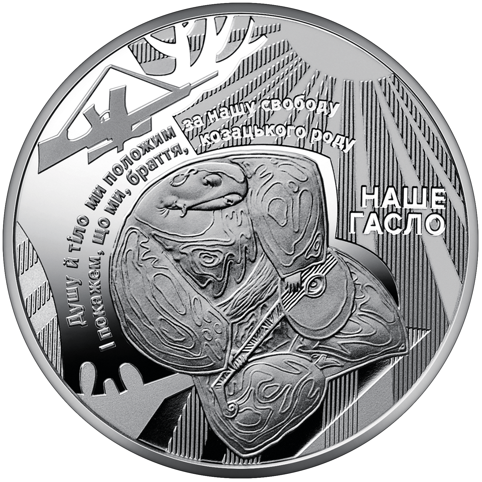 На реверсі монети “Наш гімн” в обрамленні променів зображено козака Мамая під стовбуром дуба – образ вільної людини, захисника, воїна, мандрівника, вправного вершника – як уособлення ментальності українців, як символ вічного захисника України, доповнений сучасними реаліями – замість шаблі на дубі висить сучасна зброя; розміщено написи: рядки гімну – ДУШУ Й ТІЛО МИ ПОЛОЖИМ ЗА НАШУ СВОБОДУ/І ПОКАЖЕМ, ЩО МИ, БРАТТЯ, КОЗАЦЬКОГО РОДУ (півколом над козаком) – слова, актуальні для сьогодення; НАШЕ ГАСЛО (праворуч від козака).