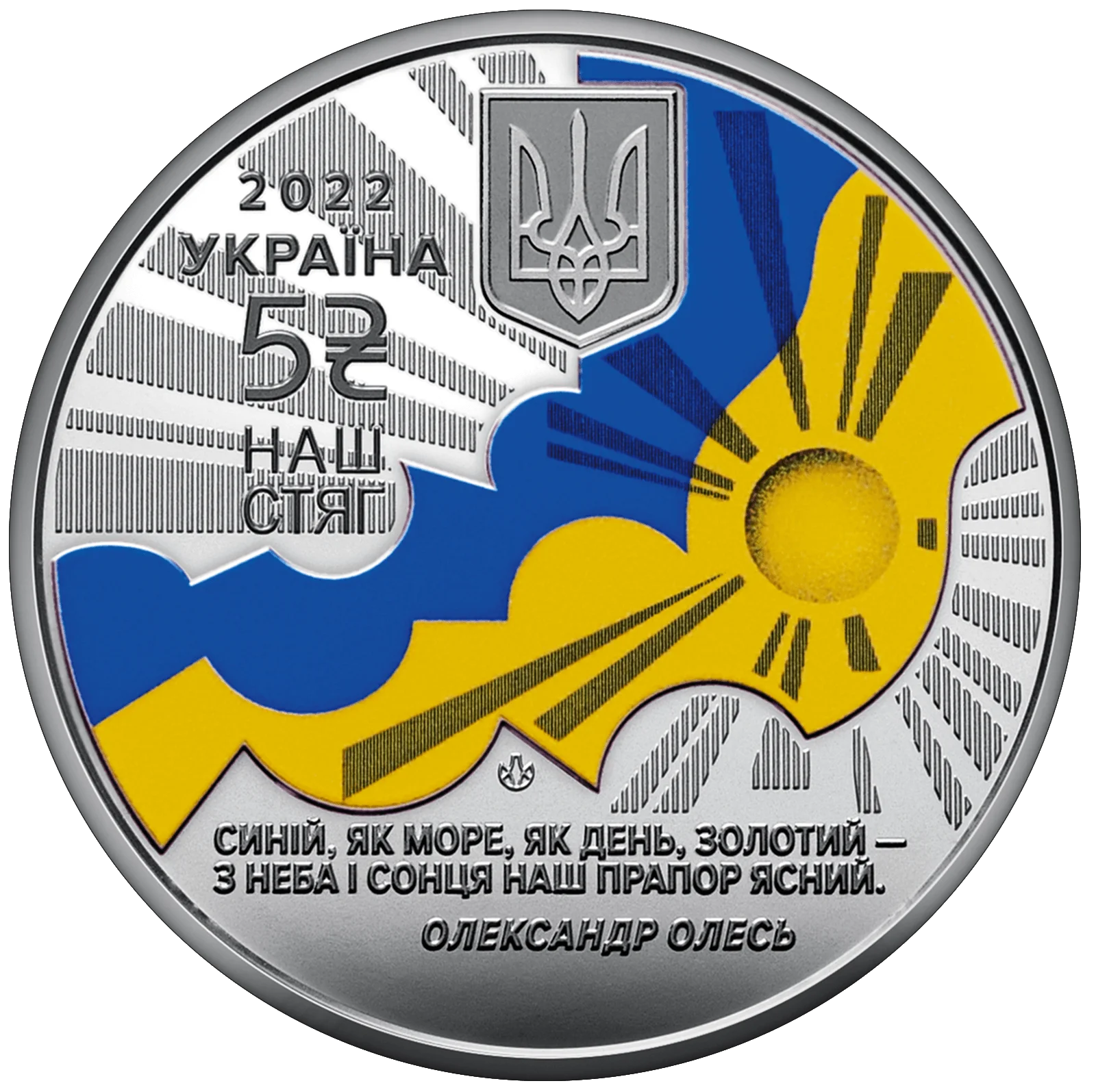 На аверсі монети “Наш стяг” розміщено: угорі – малий Державний Герб України; на тлі променів – синьо-жовтий (використано тамподрук) стилізований прапор, що майорить, та написи: ліворуч – 2022/УКРАЇНА/5 і графічний символ гривні/НАШ/СТЯГ, унизу – рядки з вірша “Прапор”: СИНІЙ, ЯК МОРЕ, ЯК ДЕНЬ, ЗОЛОТИЙ – /З НЕБА І СОНЦЯ НАШ ПРАПОР ЯСНИЙ./ОЛЕКСАНДР ОЛЕСЬ та логотип Банкнотно-монетного двору Національного банку України.