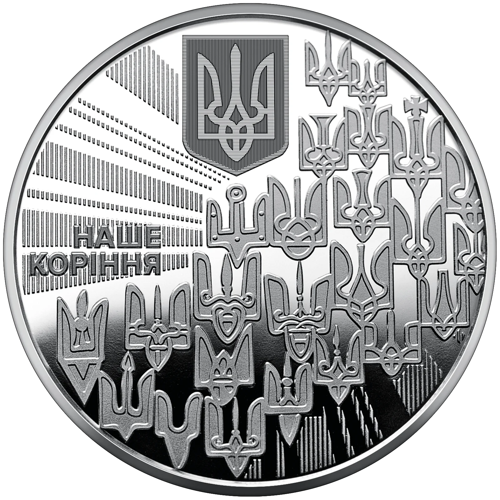 На реверсі монети “Наш герб” в обрамленні променів розміщено композицію із тризубів, що символізує наш історичний спадок – від витоків, двозуба Святослава Хороброго, знаків на златниках та срібляниках, через знаки періоду Визвольних змагань 1917–1921 років до сучасного символу держави (латентне зображення); ліворуч напис – НАШЕ КОРІННЯ.