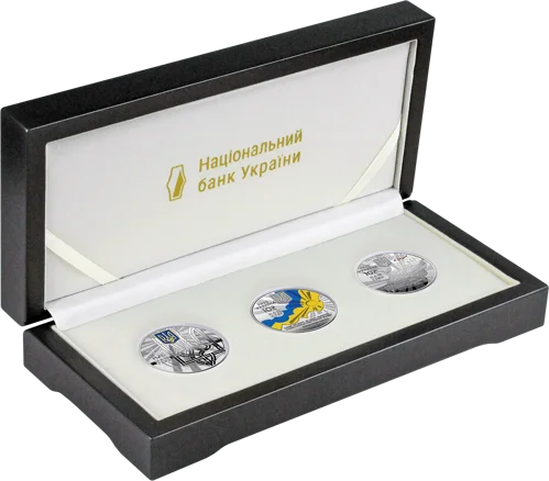 Набір із трьох срібних пам’ятних монет присвячений головним атрибутам української державності – гербу, прапору та гімну – як невід’ємним складовим національної ідентичності, глибоко вкоріненим у культурі, історії та ментальності українського народу. Тризуб як Знак Княжої Держави Володимира Великого уособлює історичну спадковість, духовну єдність та прагнення українців до свободи й самовизначення. Прапор, поєднуючи синій та жовтий кольори, знаменує добробут, природні багатства та процвітання України. Це кольори чистого неба і пшеничного лану, що були офіційно затверджені ще на прапорі Української Народної Республіки. Патріотична пісня “Ще не вмерла Україна” за півтора століття стала потужним символом боротьби за незалежність, що надихає наш народ на єдність та зміцнює почуття національної гордості.