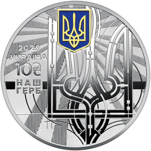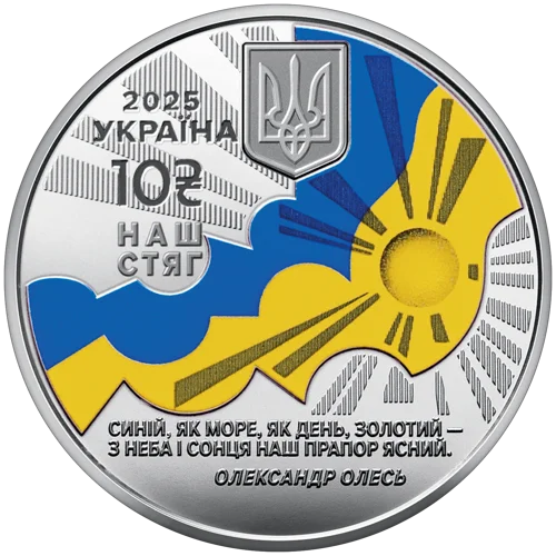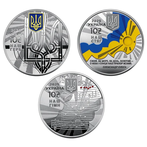 На аверсі монети “Наш герб” розміщено: угорі – малий Державний Герб України, золотий тризуб на синьому щиті (елементи оздоблення – емаль та локальна позолота); на тлі променів – стилізований Знак Княжої Держави Володимира Великого, зображення якого відтворює схему побудови тризуба; ліворуч написи: 2025 / УКРАЇНА / 10 / НАШ / ГЕРБ. На аверсі монети “Наш стяг” розміщено: угорі – малий Державний Герб України; на тлі променів – синьо-жовтий (елемент оздоблення – кольоровий друк) стилізований прапор, що майорить, та написи: ліворуч – 2025 / УКРАЇНА / 10 / НАШ / СТЯГ, унизу – рядки з вірша “Прапор”: СИНІЙ, ЯК МОРЕ, ЯК ДЕНЬ, ЗОЛОТИЙ – / З НЕБА І СОНЦЯ НАШ ПРАПОР ЯСНИЙ. / ОЛЕКСАНДР ОЛЕСЬ. На аверсі монети “Наш гімн” розміщено: на тлі гілки калини з червоними ягідками (елемент оздоблення – емаль) – малий Державний Герб України та нотні рядки на тлі променів; ліворуч написи: 2025 / УКРАЇНА / 10 / НАШ / ГІМН.