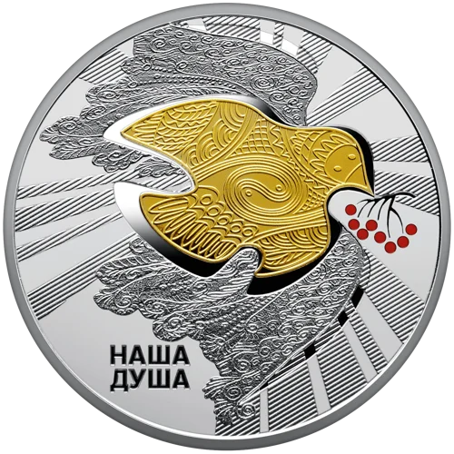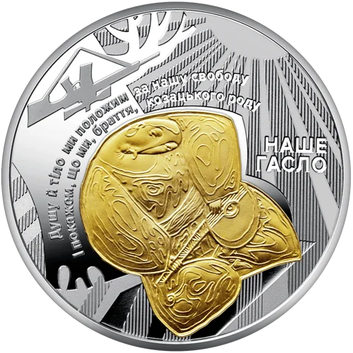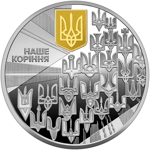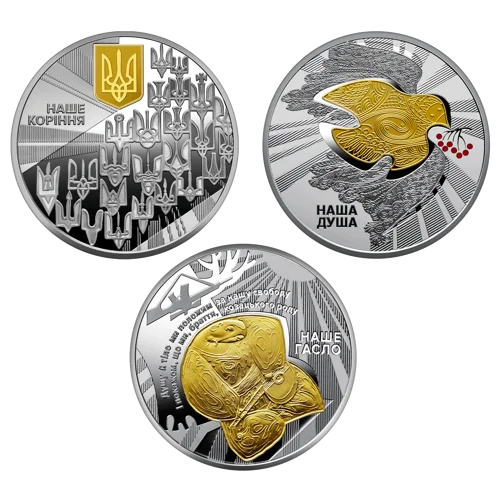 На реверсі монети “Наш герб” в обрамленні променів на дзеркальному тлі розміщено композицію із тризубів, що символізує наш історичний спадок – від витоків, двозуба Святослава Хороброго, знаків на златниках та срібляниках, через знаки періоду Української революції 1917–1921 років до сучасного символу держави (латентне зображення); угорі – малий Державний Герб України (елемент оздоблення – локальна позолота); ліворуч напис – НАШЕ / КОРІННЯ. На реверсі монети “Наш стяг” в обрамленні променів рельєфно зображено оздобленого орнаментами стилізованого птаха (елемент оздоблення – локальна позолота), який тримає гроно калини і символізує українську душу в її прагненні до волі та незалежності; унизу напис – НАША / ДУША. На реверсі монети “Наш гімн” в обрамленні променів зображено козака Мамая (елемент оздоблення – локальна позолота) під стовбуром дуба – образ вільної людини, захисника, воїна, мандрівника, вправного вершника – як уособлення ментальності українців, як символ вічного захисника України, доповнений сучасними реаліями – замість шаблі на дубі висить сучасна зброя; розміщено написи: рядки гімну – ДУШУ Й ТІЛО МИ ПОЛОЖИМ ЗА НАШУ СВОБОДУ / І ПОКАЖЕМ, ЩО МИ, БРАТТЯ, КОЗАЦЬКОГО РОДУ (півколом над козаком) – слова, актуальні для сьогодення; НАШЕ / ГАСЛО (праворуч від козака).