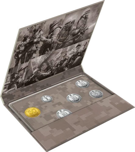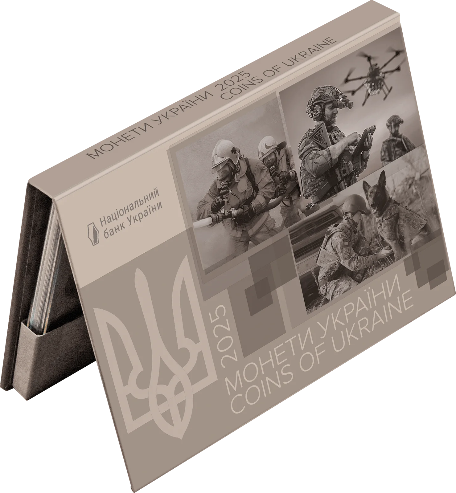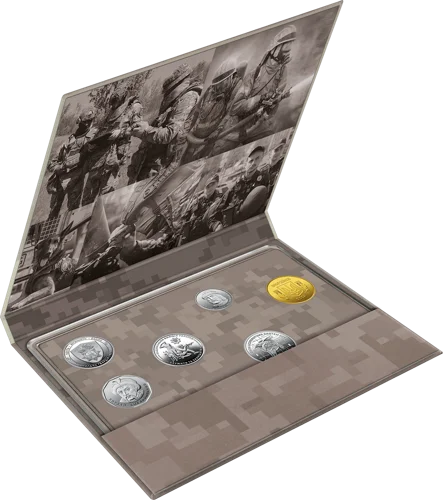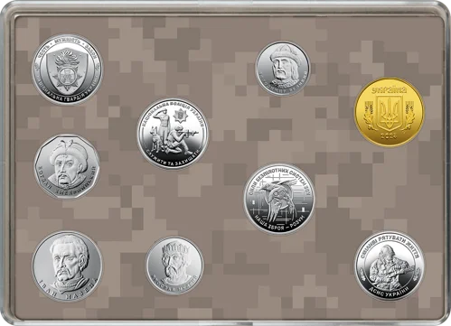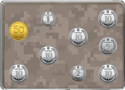 До набору входять: розмінна монета номіналом 50 копійок, обігові монети номіналами 1, 2, 5, 10 гривень та обігові пам’ятні монети номіналом 10 гривень – “Національна гвардія України”, “Сили безпілотних систем Збройних Сил України”, “Національна поліція України”, “Державна служба України з надзвичайних ситуацій”.