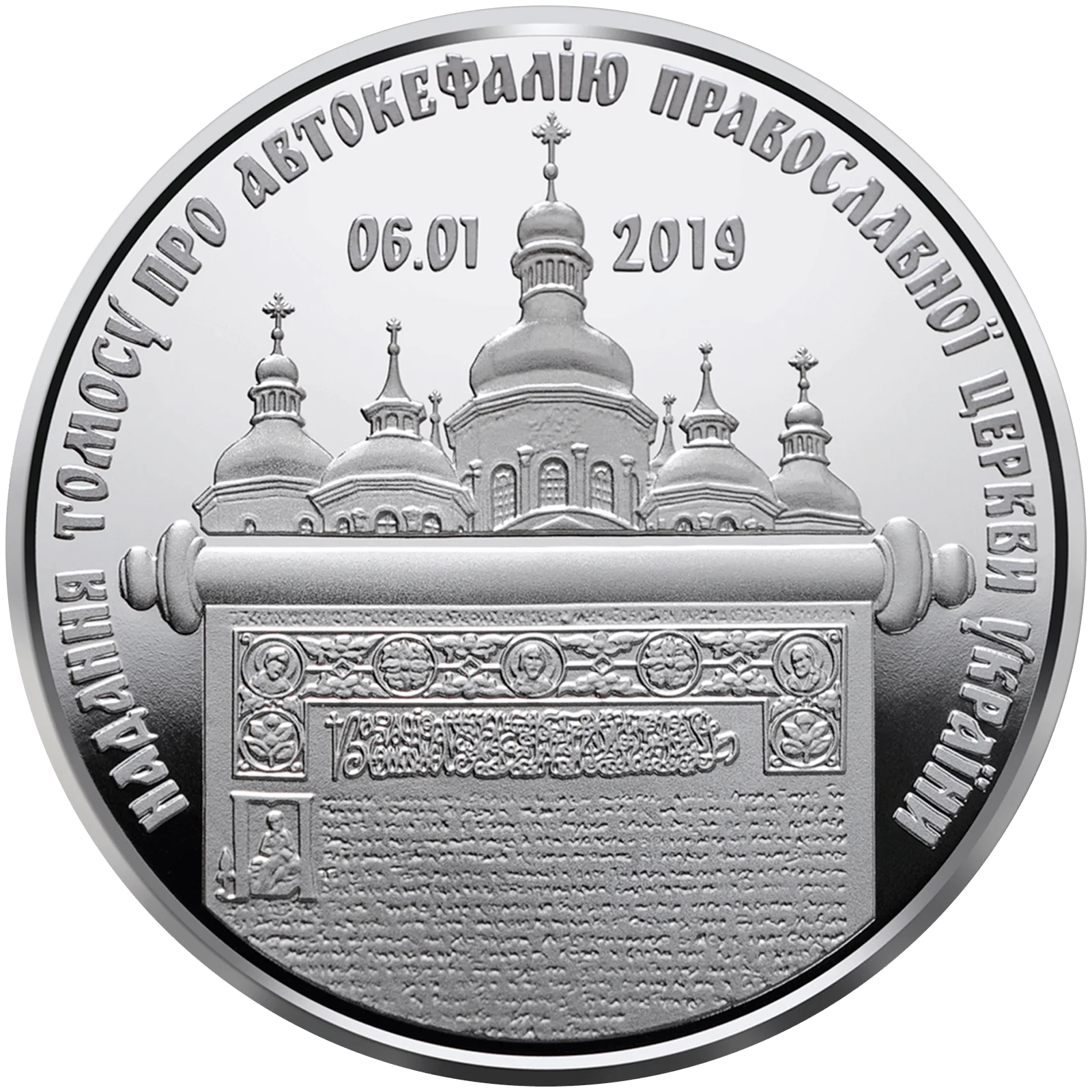На реверсі монети на тлі бань Софійського собору зображено стилізований фрагмент Томосу, по обидва боки від центрального куполу зазначена дата надання Томосу 06.01 та 2019; по колу напис: НАДАННЯ ТОМОСУ ПРО АВТОКЕФАЛІЮ ПРАВОСЛАВНОЇ ЦЕРКВИ УКРАЇНИ.