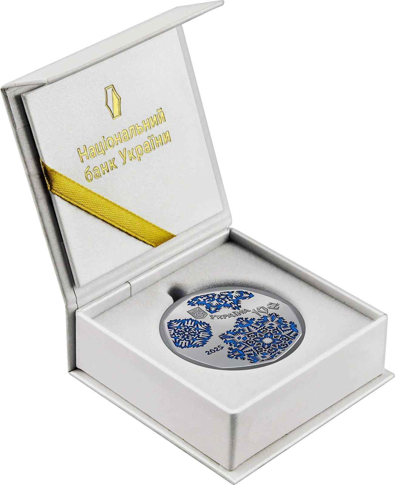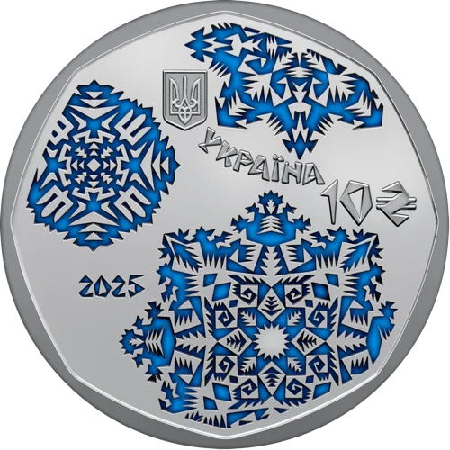На аверсі монети розміщено витончений декоративний витинанковий мотив у вигляді сніжинок, які традиційно використовуються для прикрашання зимових вікон. У верхній частині монети, між сніжинками, зображено малий Державний Герб України, номінал 10 та графічний символ гривні, а також написи УКРАЇНА / 2025.