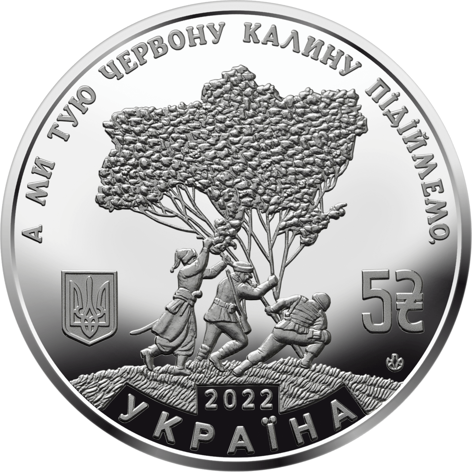 На аверсі монети на дзеркальному тлі розміщено: малий Державний Герб України (ліворуч), у центрі – стилізовану символічну композицію: захисники різних поколінь – козак, січовий стрілець і сучасний воїн Збройних Сил України, підіймають калину – опоетизований символ України, крона якої нагадує абриси кордонів нашої Батьківщини; написи: А МИ ТУЮ ЧЕРВОНУ КАЛИНУ ПІДІЙМЕМО, (угорі півколом), унизу рік карбування – 2022 та півколом – УКРАЇНА, праворуч номінал – 5 та розміщено графічний символ гривні; унизу праворуч (під номіналом) логотип Банкнотно-монетного двору Національного банку України.