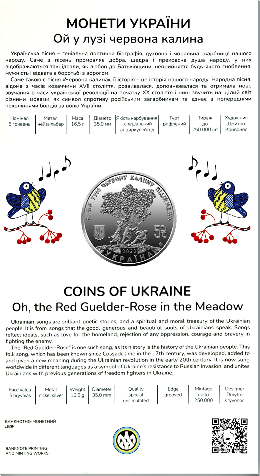 Пам`ятна монета присвячена українській народній пісні авторського походження, яка під час безжальної війни росії проти України зазвучала з новою силою, стала українським символом незламності, гімном мужнього протистояння. Українська пісня – це геніальна поетична біографія, духовна і моральна скарбниця нашого народу. З пісень промовляє добра, щедра і прекрасна душа українського народу, у ній відображаються такі ідеали, як любов до Батьківщини, неприйняття будь-якого гноблення, мужність і відвага в боротьбі з ворогом. Саме такою є пісня “Ой у лузі червона калина”, історія якої – це історія нашого народу. Народна пісня, відома з часів козаччини ХVІІ століття, розвивалася, доповнювалася та отримала нове звучання в часи української революції на початку ХХ століття, а нині звучить на цілий світ різними мовами і єднає з попередніми поколіннями борців за волю України.