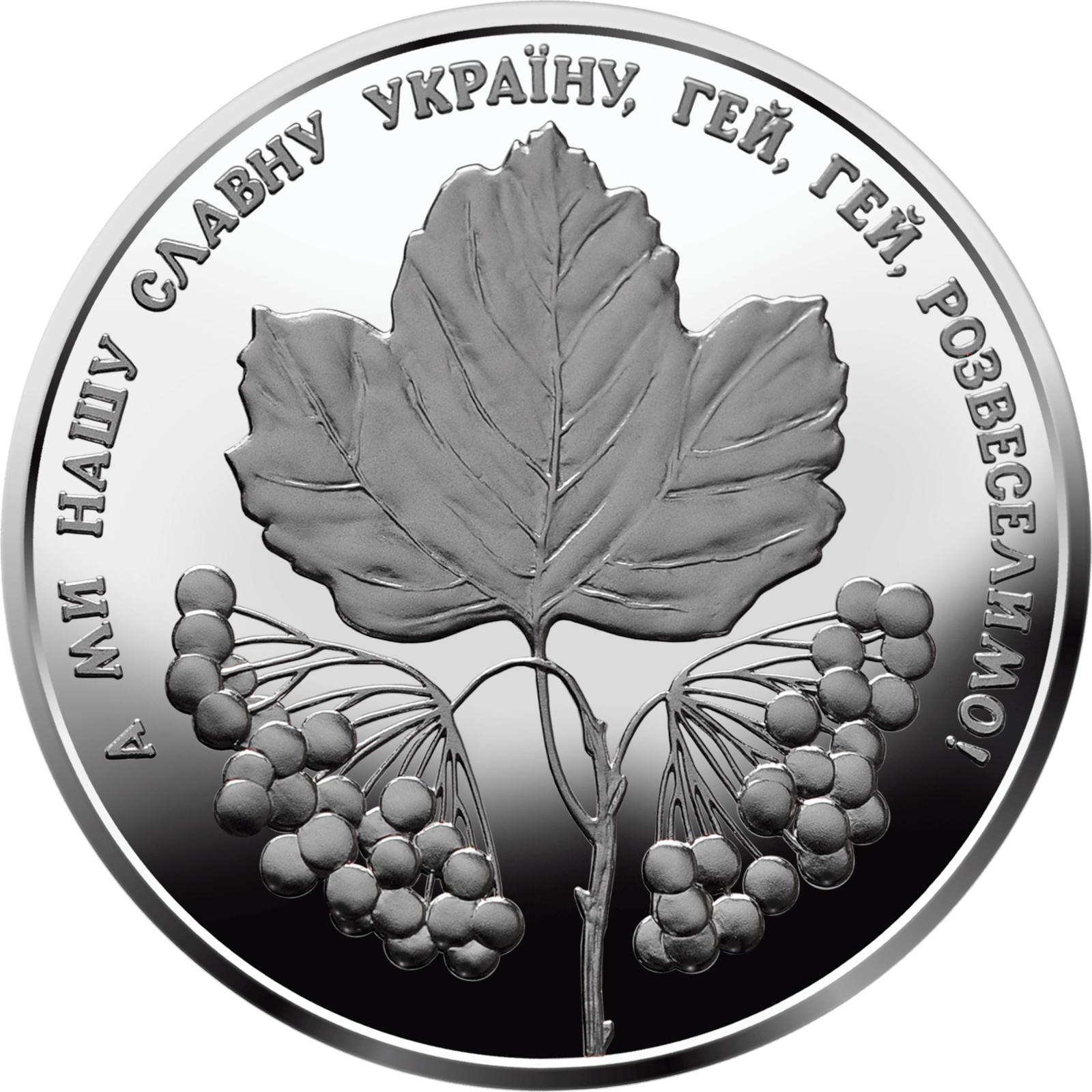 На реверсі монети на дзеркальному тлі розміщено: угорі півколом напис – продовження пісні: А МИ НАШУ СЛАВНУ УКРАЇНУ, ГЕЙ, ГЕЙ, РОЗВЕСЕЛИМО!; у центрі зображено гілку – листок і ягоди калини.