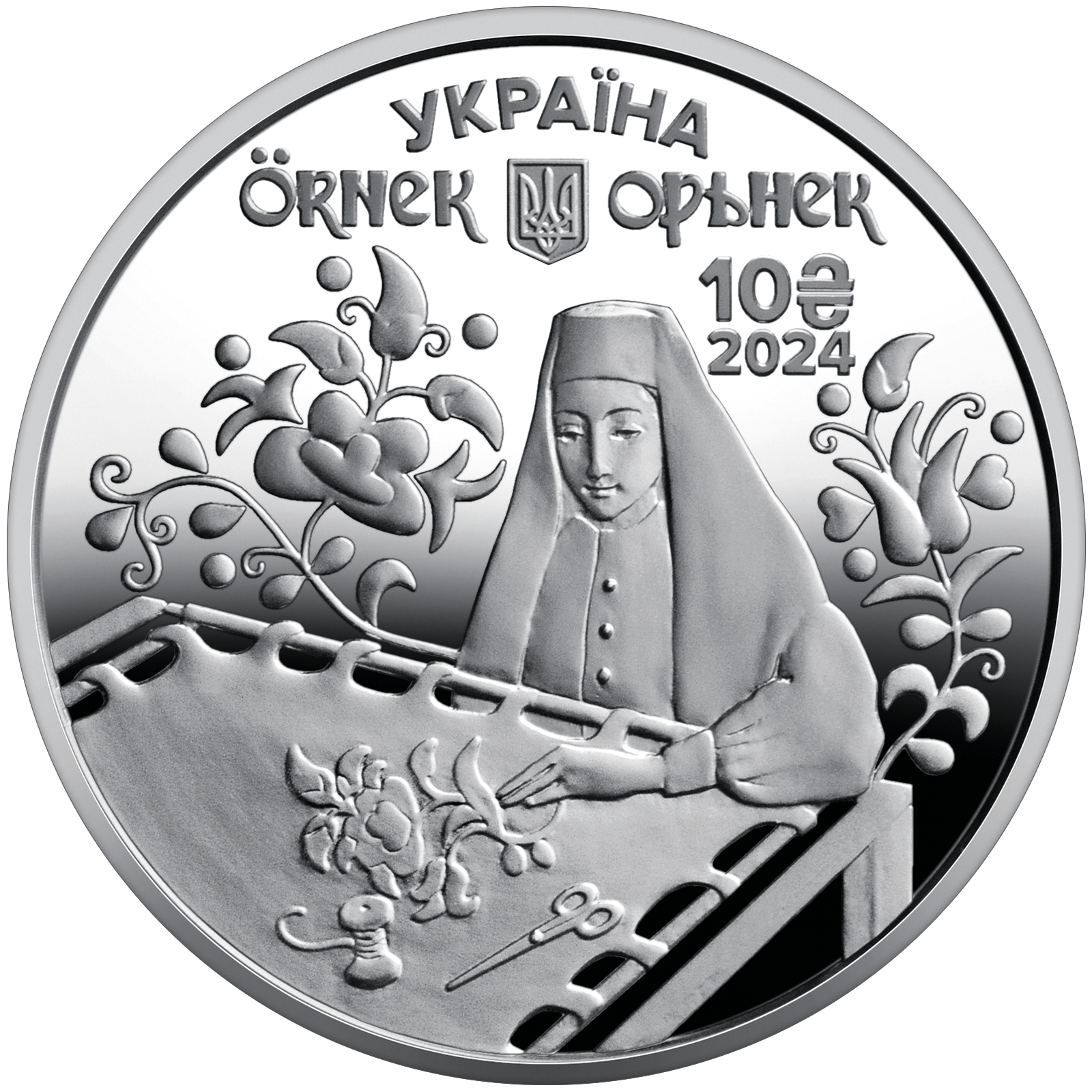 номінал 10 та графічний символ гривні, рік карбування – 2024 (праворуч від майстрині).