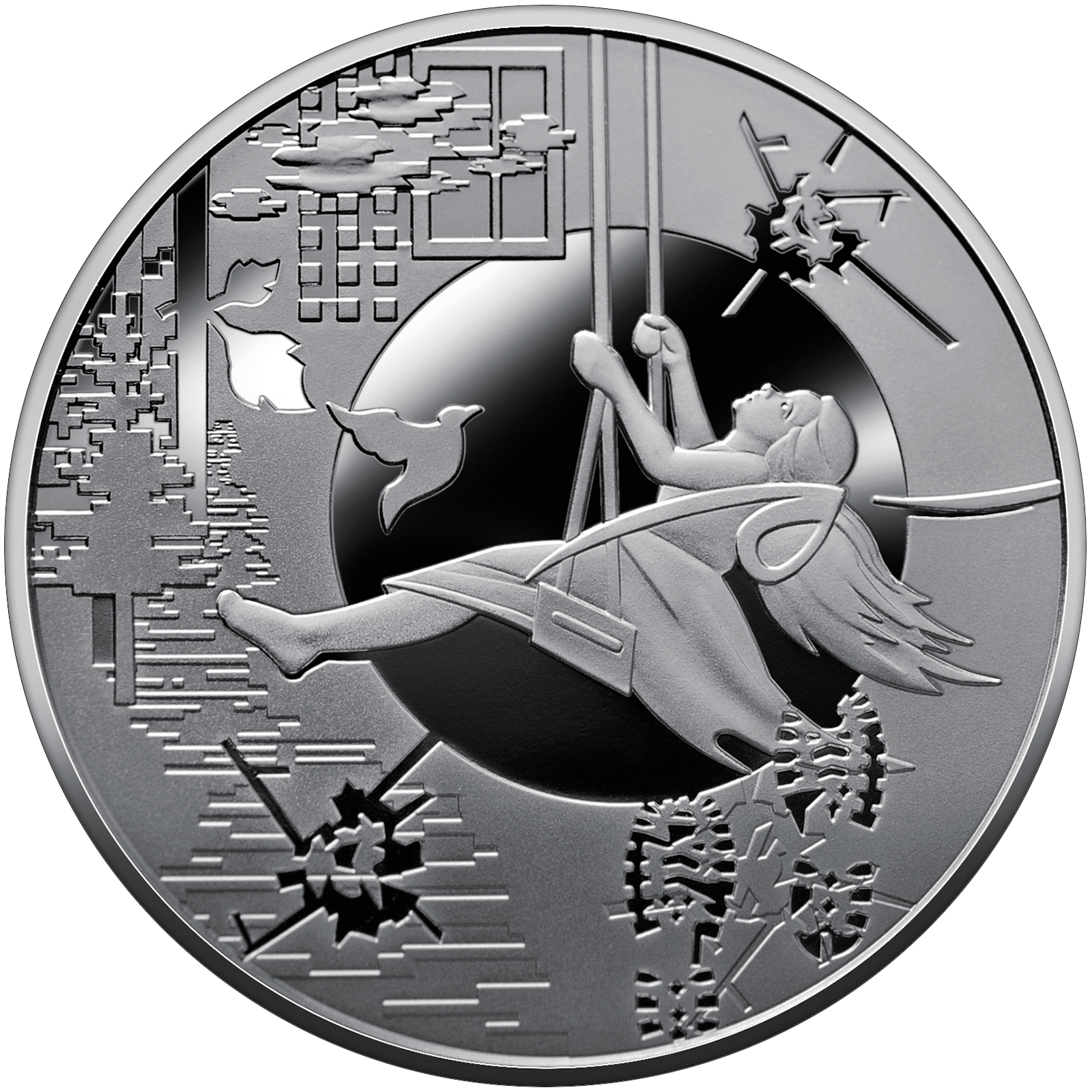 На реверсі медалі на дзеркальному тлі зображено дівчинку на гойдалці, у якої під час “польоту” розривається стрічка для волосся, що символізує перерване життя; унизу праворуч – відбитки брудних чобіт ворога, який вторгся в мирне життя українців; ліворуч – птах як символ продовження життя (біля дівчинки); стилізоване місто (угорі); ліс; прострілена “ріка життя” (унизу).