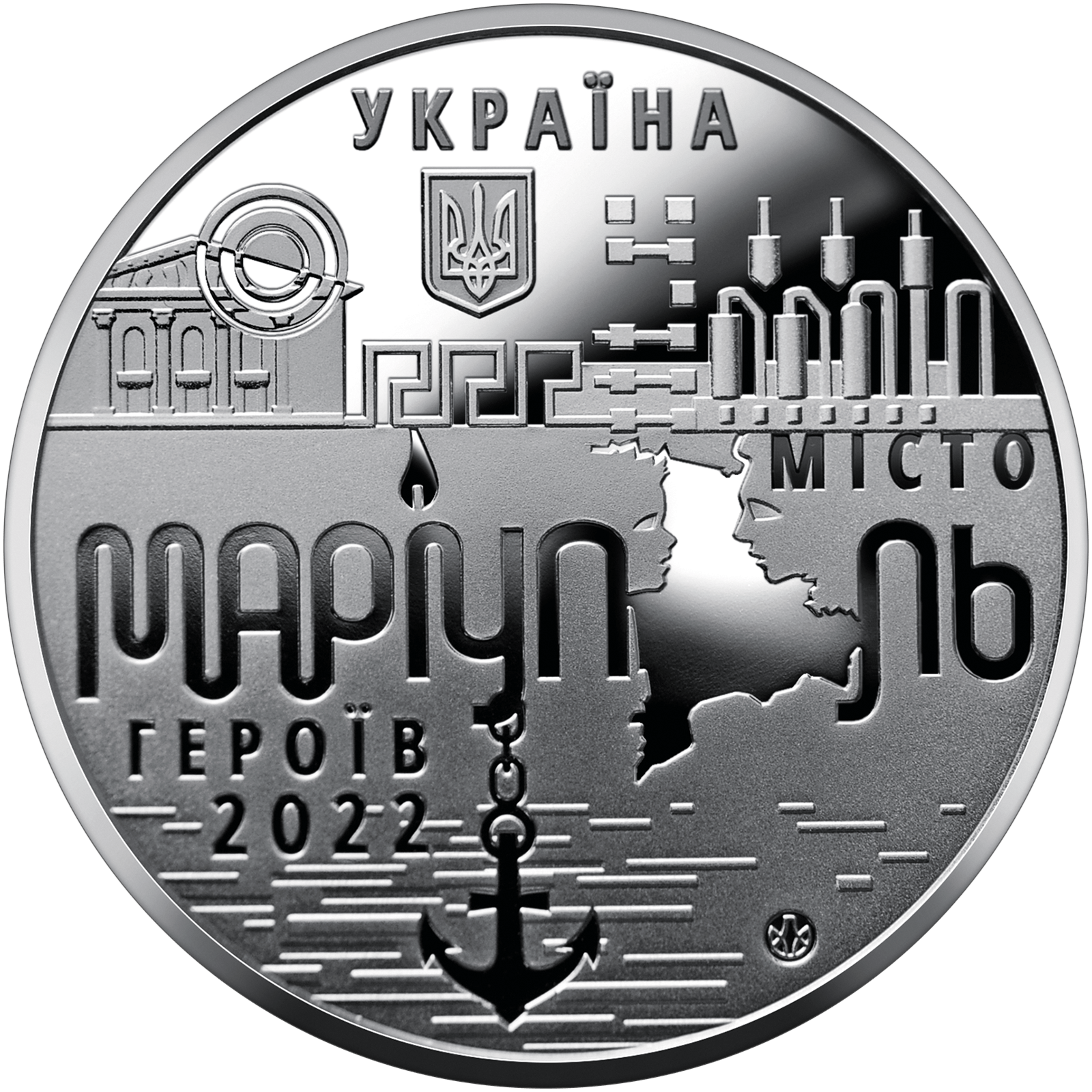 На аверсі медалі розміщено: угорі напис УКРАЇНА, під яким малий Державний Герб України; композицію, що символізує місто-герой: фасад драматичного театру під прицілом (ліворуч), стилізовані конструкції Азовсталі, на які летять бомби (праворуч); на матовому тлі дзеркальні написи: МІСТО/ МАРІУПОЛЬ/ГЕРОЇВ/2022, у написанні слова “Маріуполь” літеру “і” заміняє свічка як символ пам’яті за загиблими, літеру “о” імітує карта міста, створена з двох профілів – дитячого та дорослого, як символ примусової депортації; унизу на тлі стилізованих хвиль зображено якір – один з геральдичних елементів, що є на гербі Маріуполя, як образ надії на звільнення та відродження українського міста; логотип Банкнотно-монетного двору Національного банку України (унизу праворуч).