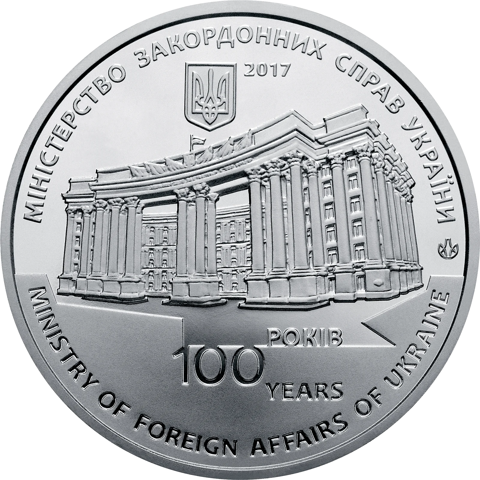 На аверсі медалі розміщено: угорі - малий Державний Герб України, праворуч від якого рік - 2017; у центрі на дзеркальному тлі - будівля, в якій нині розміщується Міністерство закордонних справ України - центральний орган виконавчої влади, який забезпечує проведення зовнішньої політики держави, і написи: 100/РОКІВ/YEARS (під будівлею), МІНІСТЕРСТВО ЗАКОРДОННИХ СПРАВ УКРАЇНИ (півколом угорі), MINISTRY OF FOREIGN AFFAIRS OF UKRAINE (півколом унизу); праворуч - логотип Банкнотно-монетного двору Національного банку України.