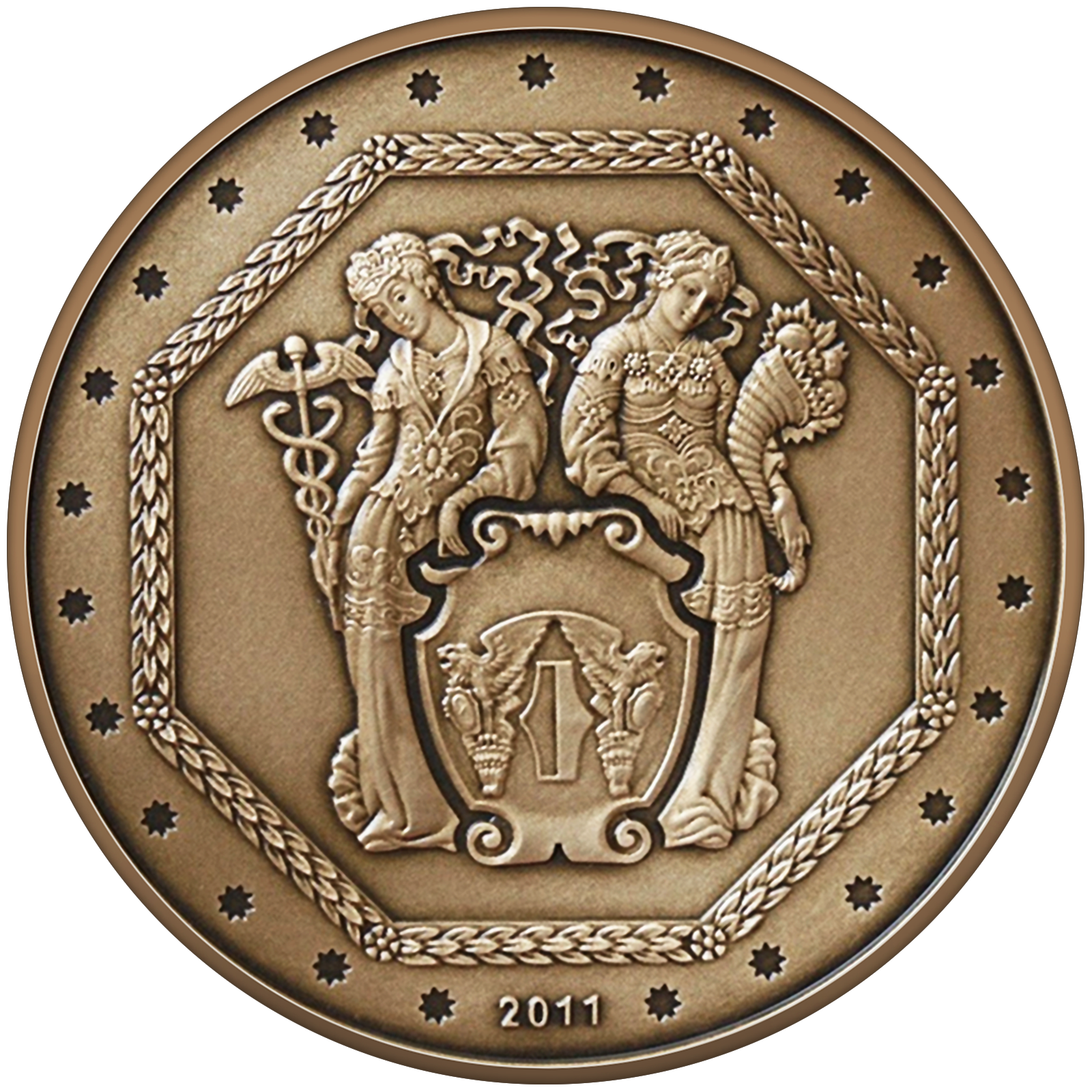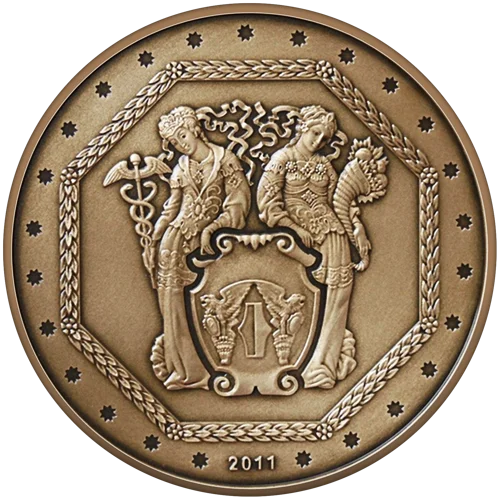 На реверсі медалі на дзеркальному тлі у восьмикутному картуші на дзеркальному тлі зображено алегоричні жіночі фігури, які символізують торгівлю, багатство, добробут, могутність та щедрість і тримають розгорнутий сувій із зображенням емблеми Національного банку України. Унизу по центру розміщено рік карбування медалі – 2011.