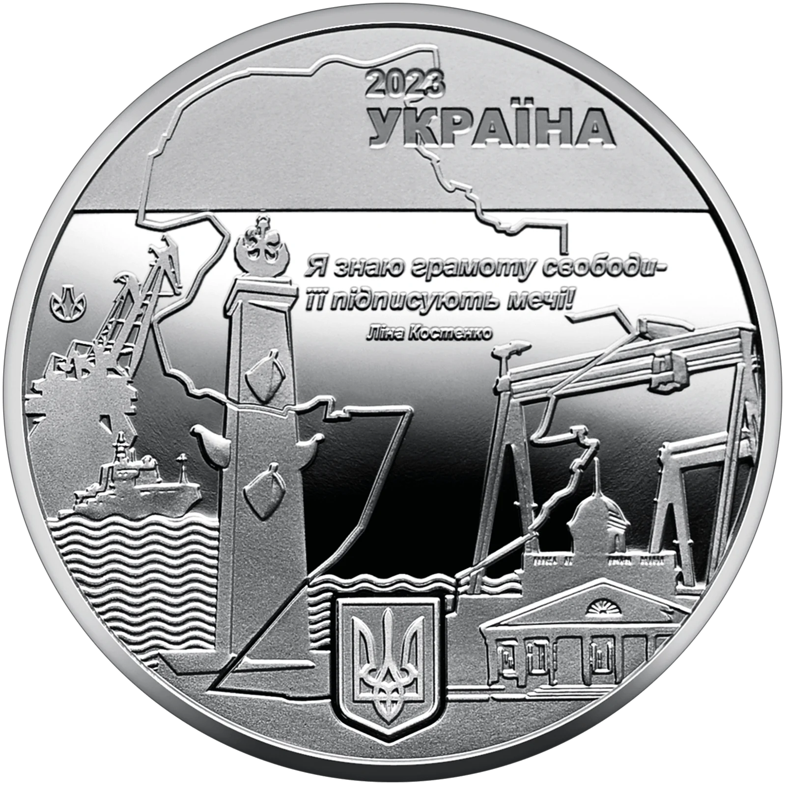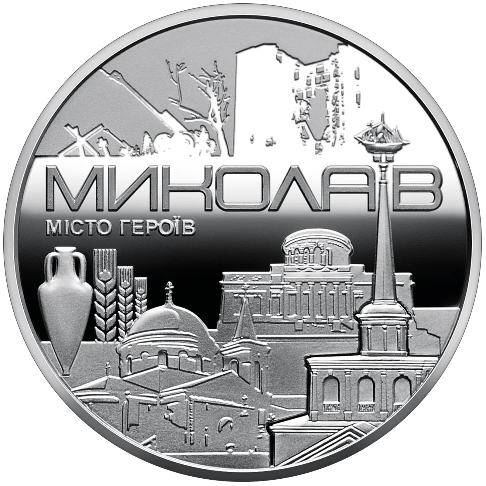 На аверсі медалі розміщено: угорі написи – 2023 / УКРАЇНА, унизу – малий Державний Герб України, у центрі, на тлі стилізованої карти міста, рядки з історичного роману Ліни Костенко “Берестечко”: Я ЗНАЮ ГРАМОТУ СВОБОДИ – / ЇЇ ПІДПИСУЮТЬ МЕЧІ! / ЛІНА КОСТЕНКО; стилізовану композицію, яка підкреслює, що Миколаїв – місто суднобудування та морський порт; праворуч – будівля єдиного в країні Миколаївського музею суднобудування; логотип Банкнотно-монетного двору Національного банку України (ліворуч).