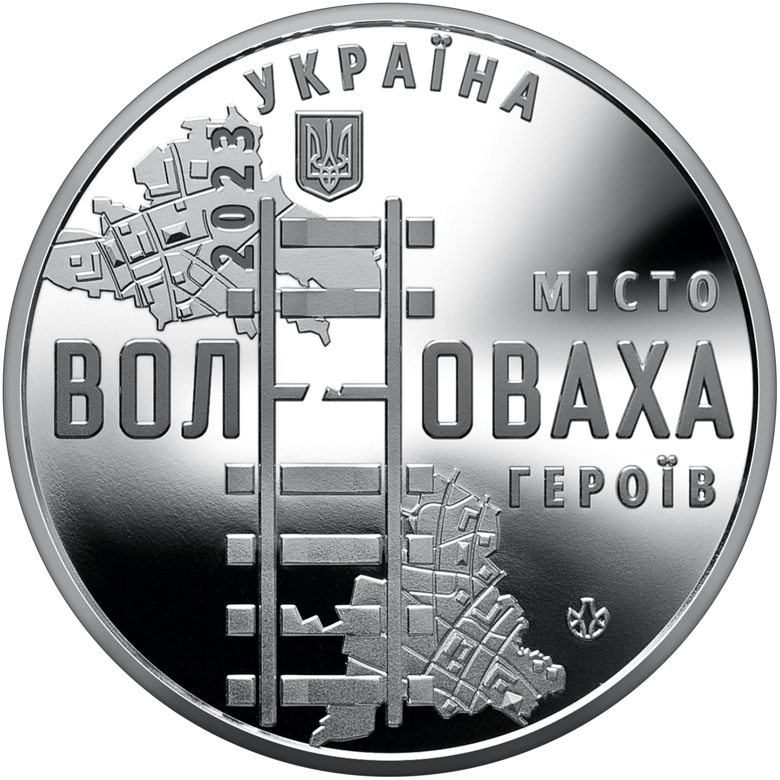 На аверсі медалі розміщено: угорі – напис УКРАЇНА (півколом), під яким – малий Державний Герб України та рік карбування медалі – 2023 (вертикально на тлі мапи); у центрі на дзеркальному тлі написи: МІСТО/ВОЛНОВАХА/ГЕРОЇВ (використано шрифт ZERNO, автор О. Ліщук), у написі слова “Волноваха” літеру “н” заміняє фрагмент залізничної колії, яка досягає малого Державного Герба України та символізує прагнення міста повернутися додому, в Україну; стилізовані фрагменти мап міст – Донецька (угорі), Маріуполя (унизу); логотип Банкнотно-монетного двору Національного банку України (унизу праворуч).