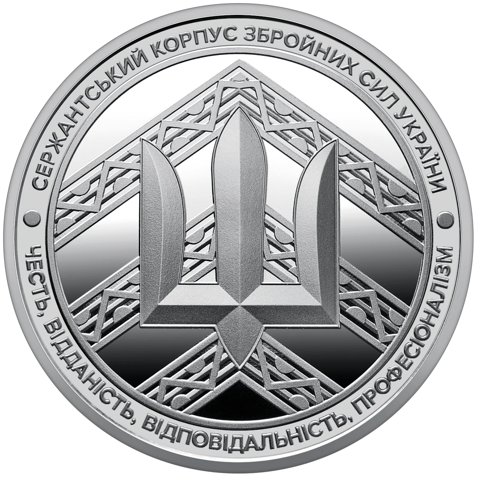 На реверсі медалі розміщено написи: СЕРЖАНТСЬКИЙ КОРПУС ЗБРОЙНИХ СИЛ УКРАЇНИ, девіз сержантського і старшинського складу Збройних Сил України – ЧЕСТЬ, ВІДДАНІСТЬ, ВІДПОВІДАЛЬНІСТЬ, ПРОФЕСІОНАЛІЗМ (по колу), у центрі на дзеркальному тлі зображено символіку Сержантського корпусу Збройних Сил України та стилізований тризуб, що використовується Збройними Силами України.