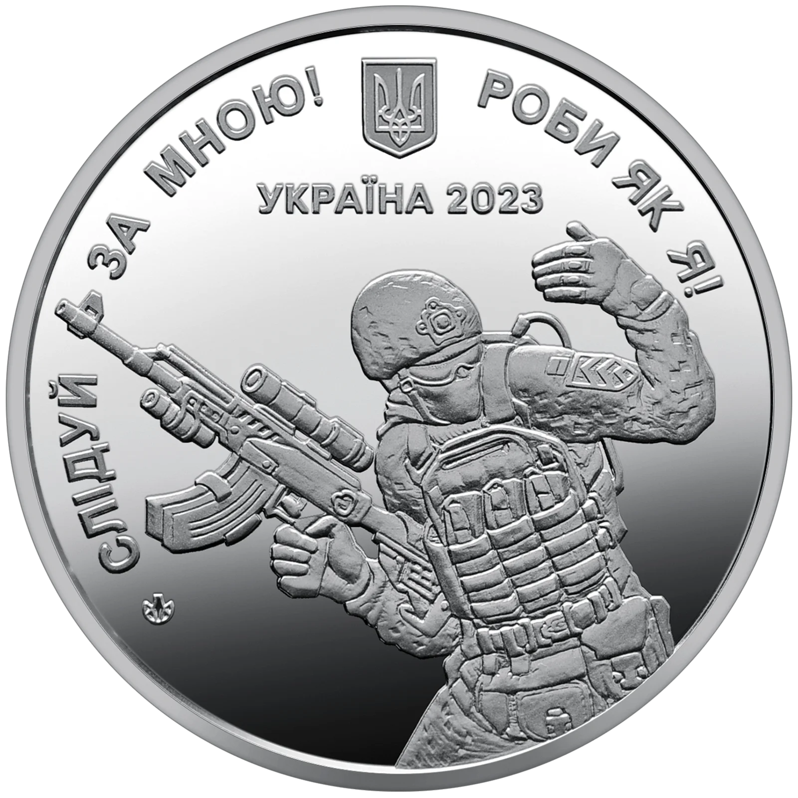 На аверсі медалі: на дзеркальному тлі розміщено гасло сержантів і старшин Збройних Сил України СЛІДУЙ ЗА МНОЮ! РОБИ ЯК Я!, в центрі зображено українського сержанта-лідера, який веде за собою солдатів у бій, угорі – малий Державний Герб України та напис УКРАЇНА, рік карбування 2023, логотип Банкнотно-монетного двору Національного банку України (ліворуч від зображення сержанта).